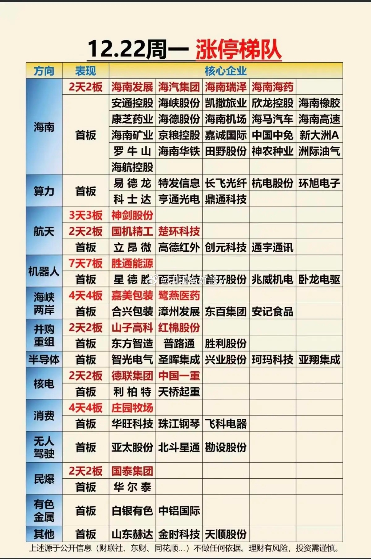 1222周一 涨停板股票:题材+高度!1.海南封关 25股涨停2.算力硬件 8股涨停3.航天航空 7股涨停4.机器人 6股涨停5.福建+ 6股涨停6.并购重组 5股涨停