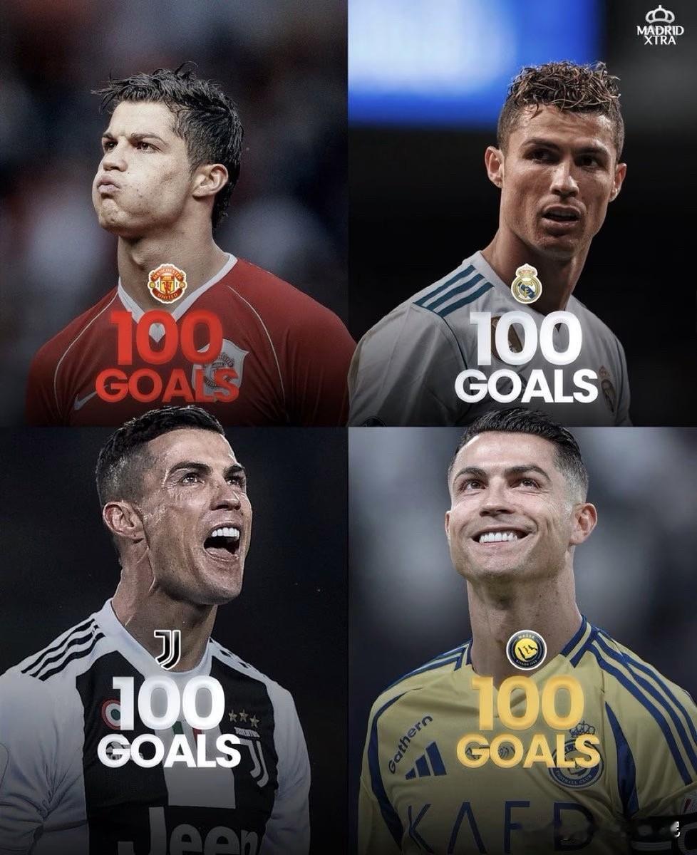 C罗职业生涯分别为曼联、皇马、尤文图斯、利雅德胜利4家不同的俱乐部攻进100个进球! 足坛罕见,绝无仅有![星星眼][星星眼]
