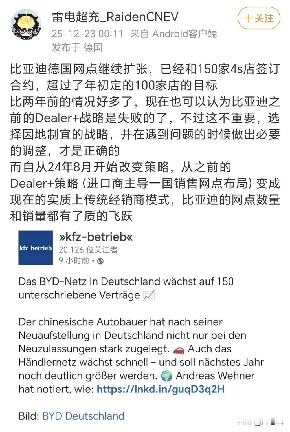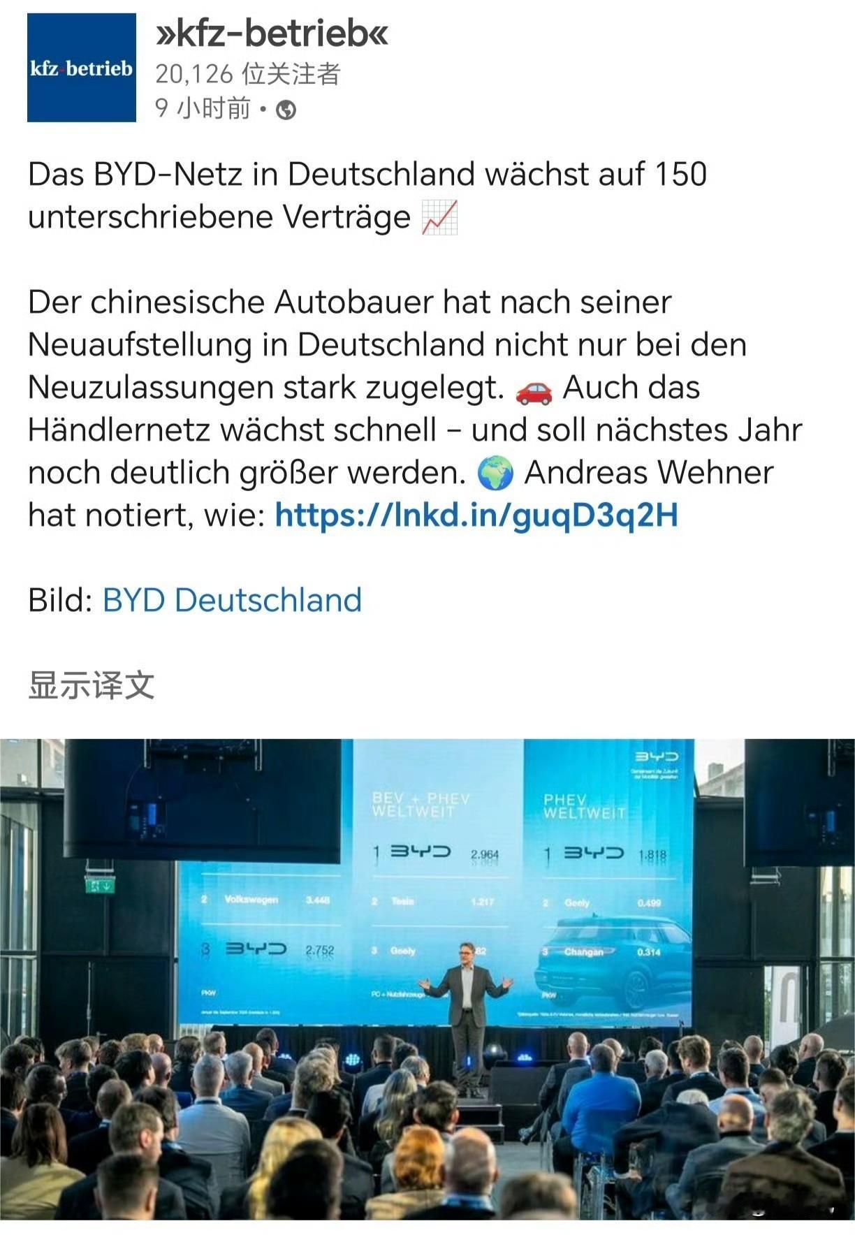 比亚迪德国已经和150家4s店签订合约。 过去的进口商主导销售模式失败,改成传统经销商模式后销量突飞猛进。 去年和今年上半年德国销售进展很慢。 今年下半年突然发力,上个月破4000创历史新高。 其实英国,德国,法国,意大利,西班牙这些传统欧洲中型国家比亚迪都有月销稳态破万的潜力。 就单单这几个国家做好了就有月四万销售的预期,不过还需要时间,最快27年应该能见到,主要看法国那边的进展了比亚迪海外发展 比亚迪海外销售 比亚迪海外战略