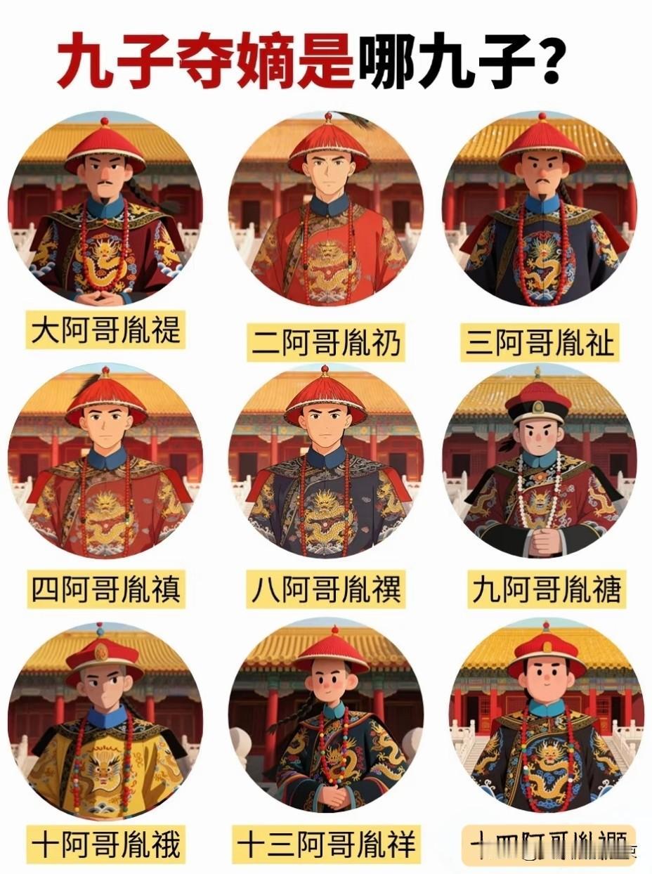 清朝九子夺嫡是哪九子? 大阿哥~爱新觉罗·胤禔、 二阿哥~爱新觉罗·胤礽、 三阿哥~爱新觉罗·胤祉、 四阿哥~爱新觉罗·胤禛、 八阿哥~爱新觉罗·胤禩、 九阿哥~爱新觉罗·胤禟、 十阿哥~爱新觉罗·胤䄉、 十三阿哥~爱新觉罗·胤祥 十四阿哥~爱新觉罗·胤禵。 最终,四阿哥~爱新觉罗·胤禛夺嫡成功,为雍正帝! 九子夺嫡 清朝那些事