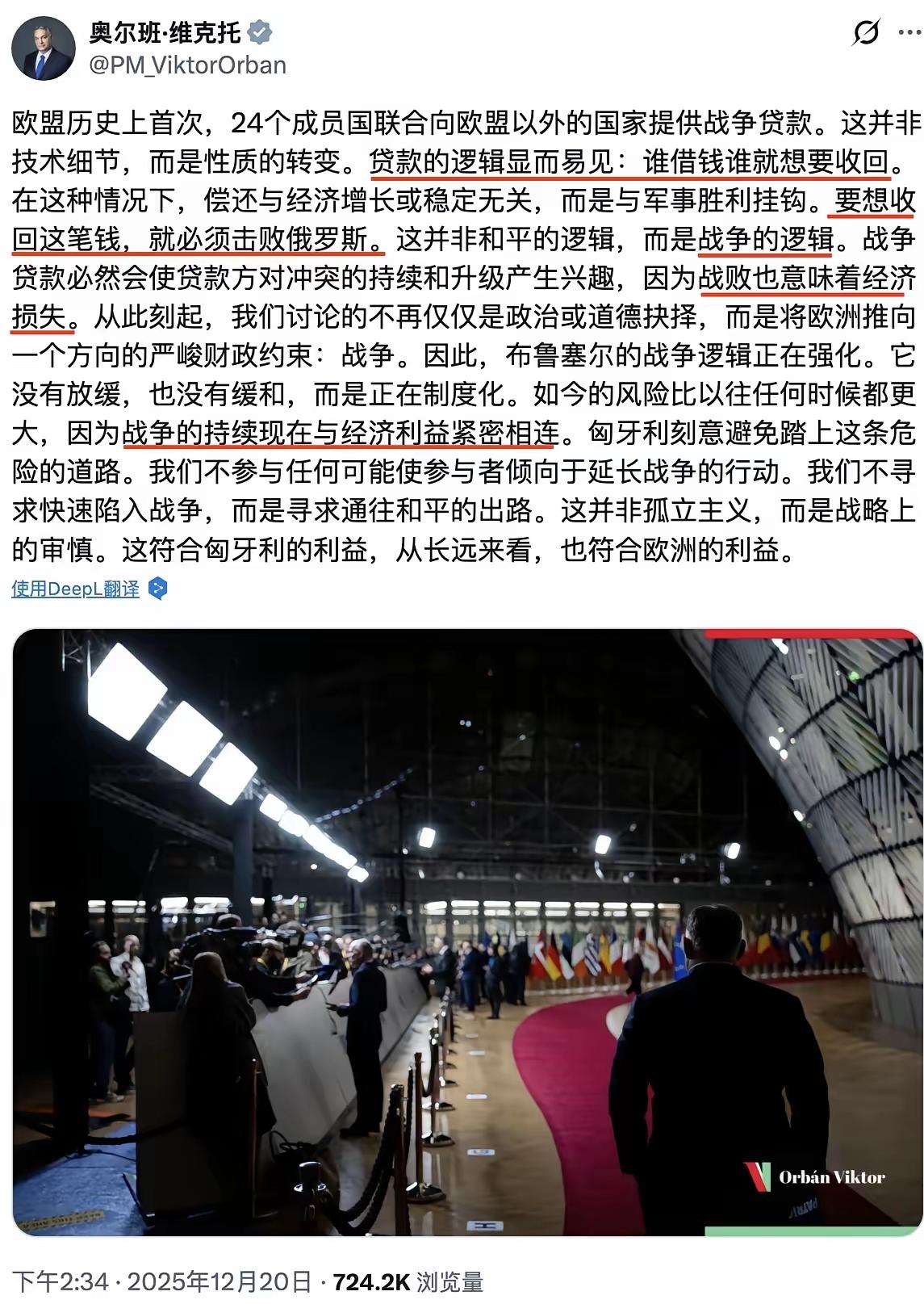 奥尔班点破关键:欧盟对乌贷款,藏着怎样的博弈逻辑? 匈牙利总理奥尔班的一条帖子,引发了广泛讨论。没有晦涩的政治术语,没有绕弯的外交辞令,他直白点出一个核心视角——欧盟给乌克兰的贷款,并非单纯的人道主义援助,更暗含着将24个出资国与乌克兰局势深度绑定的逻辑。 这一观点值得深思。俄乌冲突持续至今,欧盟对乌支持从最初的武器输送,逐渐转向巨额贷款扶持。表面上看,这是为了帮助乌克兰维持局势、应对危机,但奥尔班的分析戳中了一个关键现实:贷款不同于无偿援助,出资国必然期待收回成本,而在当前的战场语境下,这一诉求往往与“乌克兰在冲突中占据优势”绑定。这一逻辑链条如同连锁反应,投入越多,越难轻易抽身,最终形成“越陷越深、只能继续加码”的局面。 从客观角度看,欧盟的这一选择,既有地缘安全的考量,也夹杂着复杂的战略博弈。起初,欧盟或许希望通过有限投入制衡局势,却未料到战事陷入长期胶着,前期投入的资金难以收回。面对“沉没成本”,欧盟并未选择及时止损,反而推动成员国追加贷款、强化援助,这一操作在某种程度上类似博弈中的“补仓”——不甘心此前的投入付诸东流,试图通过更多资源投入换取预期中的“转机”。 但必须正视的是,战争从来不是单纯的战略博弈,其背后是无数生命的牺牲、家园的破碎,以及民生的沉重代价。欧盟的贷款,最终要么转化为战场的武器与物资消耗,要么成为成员国纳税人的负担,这也是为何部分欧盟国家内部出现抗议声音,分歧逐渐显现。漠视民生成本的战略博弈,终究难以获得民众的长期支持。 更耐人寻味的是美国的角色转变。奥尔班提到美国“离场”,并非因为忌惮俄罗斯的军事实力,而是担心俄罗斯与其他国际力量形成新的互动格局。这一判断背后,是对美国全球战略的精准洞察:美国对乌支持从始至终都带有明确的地缘算计,如今看到俄乌冲突已有效消耗俄罗斯与欧盟的精力,自身继续“台前主导”的性价比下降,便选择逐步抽身幕后,将“援乌”的主要负担留给欧洲,自己则腾出手来布局其他地区。这种“坐收渔翁之利”的战略考量,本质上是美国全球利益优先思维的体现。 回顾历史,国际政治中的“捆绑式支持”并不鲜见。二战后美国的马歇尔计划,既有援助欧洲重建的成分,也暗藏着控制西欧、遏制苏联的战略目的;如今欧盟对乌的贷款援助,同样是地缘政治与现实利益交织的产物,只是被卷入其中的,还有乌克兰的命运和无数无辜民众。欧盟作为多边主义的倡导者,本应更注重通过外交途径化解冲突,却在战略博弈中逐渐偏离初衷,沦为大国博弈的附庸,这无疑令人惋惜。 奥尔班的直言,或许让部分欧盟国家感到难堪,却揭开了国际政治的现实一面:许多看似“利他”的援助,背后往往隐藏着利益绑定的逻辑;而任何脱离民生福祉的战略博弈,终究会面临反噬。俄乌冲突的最终解决,从来不是靠贷款和武器的加码,而是需要回到谈判桌前,通过平等对话寻找共赢方案。如果欧盟继续被“收回贷款”“战略制衡”的执念裹挟,只会让战争持续更久,让更多人承受苦难。 各位读者你们怎么看?欢迎在评论区讨论。