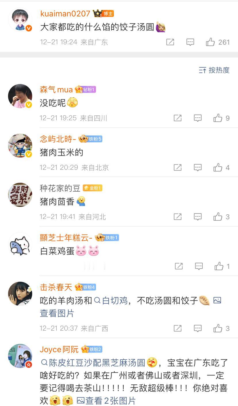 蒯曼在社交平台发布了真切的祝福和有趣的问题,是什么问题呢? 冬至重要的节日已经过完了,晚餐一定很丰富,就是这天,蒯曼祝福大家冬至快乐,还配了2张图片。 第一张图片是饺子,小巧玲珑的,会是蒯曼包的吗?配上精心调配的蘸料,味道一定美极了! 第二张图片是汤圆,南方吃汤圆,北方吃饺子,我在南方,饺子和汤圆都有吃,入乡随俗! 难得蒯曼在评论区提出了问题,大家吃的什么馅饺子喝汤圆,回答也是五花八门,啥都有,尤其白菜和鸡蛋馅,让我陷入沉思。 蒯曼多吃一点,接下来就是乒超联赛总决赛了,希望每天快乐,身体健康。