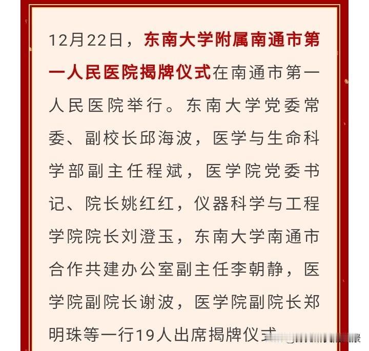 真没想到,南通第一人民医院也成为了东南大学附属医院了,这对东南大学而言简直是如虎添翼,其医学专业想不发展都难,而且东南大学的附属医院那是一个比一个厉害,比如东南大学附属中大医院在南京是前三的存在,而南通第一人民医院在南通更是找不到对手,是三甲医院。 这次合作对南通第一人民医院而言可谓利大于弊,能够借助东南大学的学科优势实现快速发展,也能吸引更多医学人才前来助力该医院的专科建设。