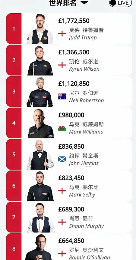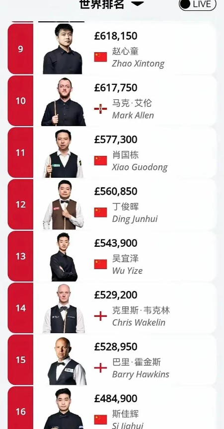 斯诺克苏格兰公开赛结束,排名榜大洗牌。90后韦克林9 - 2横扫常冰玉夺冠,奖金10万英镑,排名从30开外飙升到第14位,还拿到冠中冠参赛资格,赚得盆满钵满。常冰玉虽决赛失利,但也收获4.5万英镑,排名从90多位升至64位。 这次中国有五位选手入围世界排名前16,分别是赵心童第9、丁俊晖第12、肖国栋第11、吴宜泽第13、斯佳辉第16。赵心童若拿下大师赛冠军就是大满贯选手,丁俊晖接下来大师赛首轮对阵特鲁姆普,很是让人期待!