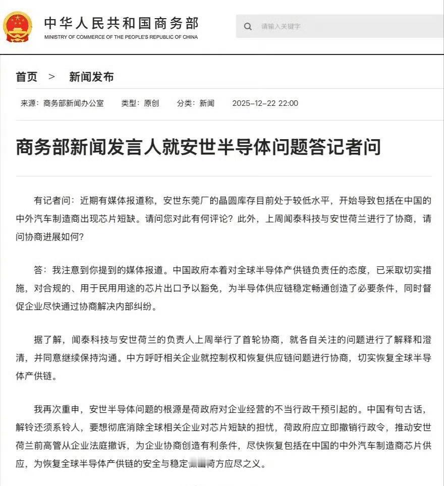 关于安世半导体问题,商务部最新回应:商务部用中国古话回应安世半导体问题商务部说到