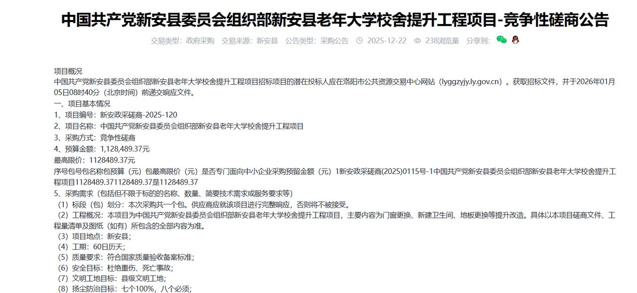 新安县老年大学校舍提升工程项目-竞争性磋商公告,预算112.8万元