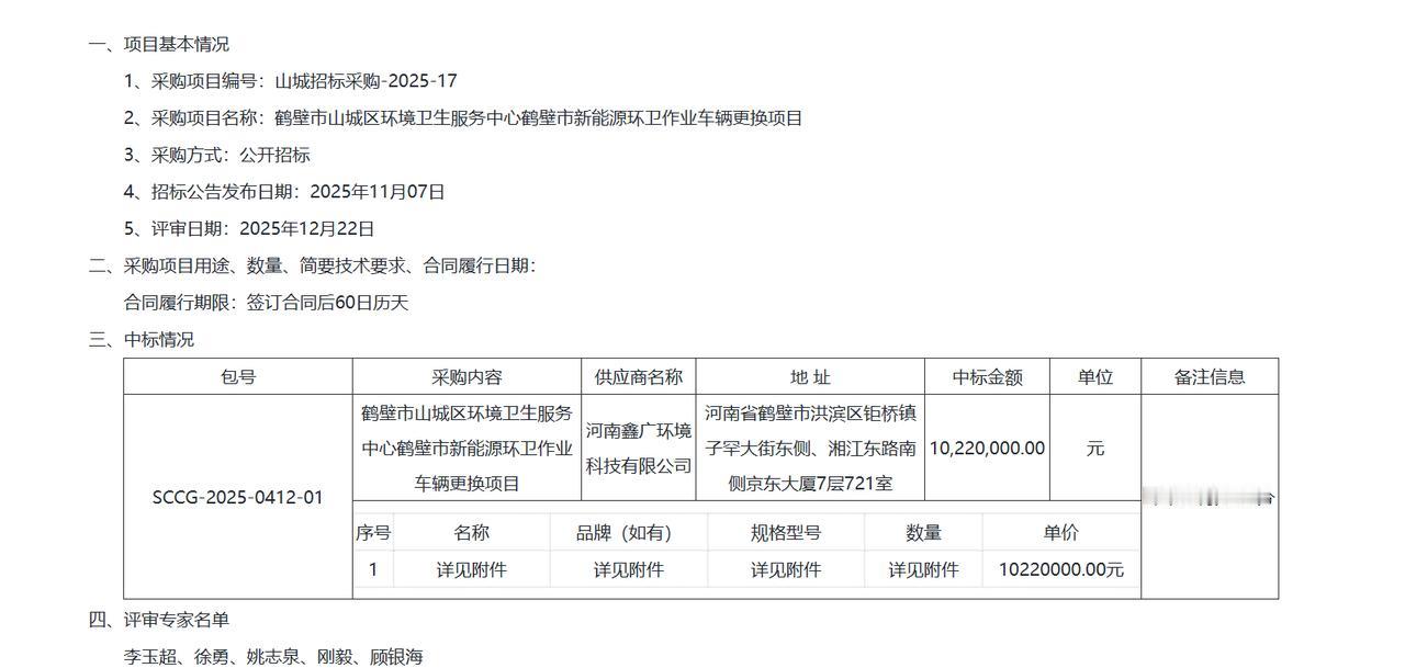 鹤壁市山城区环境卫生服务中心鹤壁市新能源环卫作业车辆更换项目-中标公告,金额1022万元