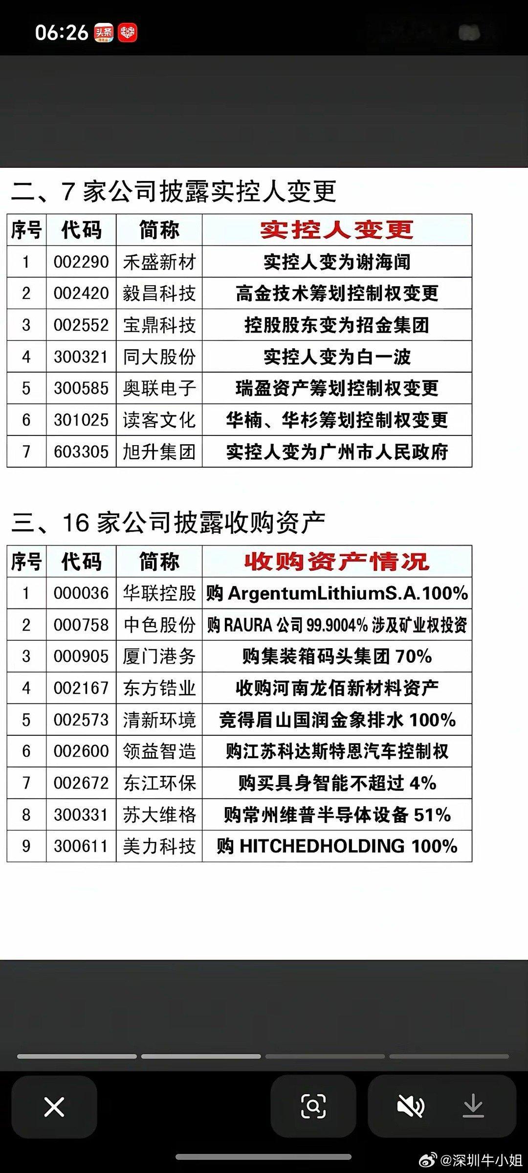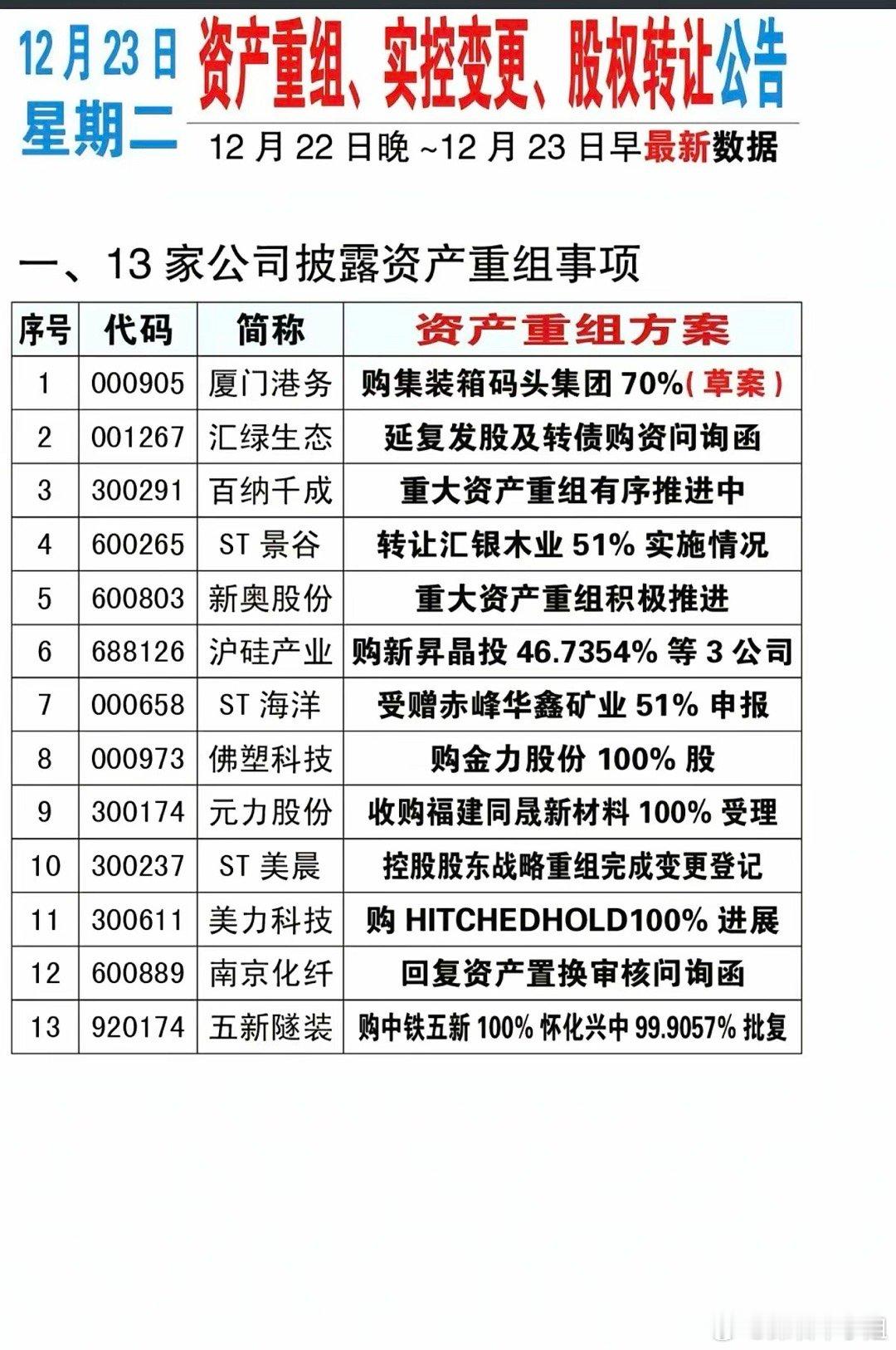 12.23周二 最新:资产重组,实控人变更,股权转让公告汇总!13家公司披露资产重组事项,7家公司实控人变更,16家公司收购资产,做大做强,17家公司实控人转让,转型升级。