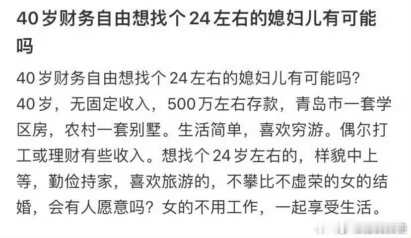 40岁财务自由想找个24左右的媳妇儿有可能吗