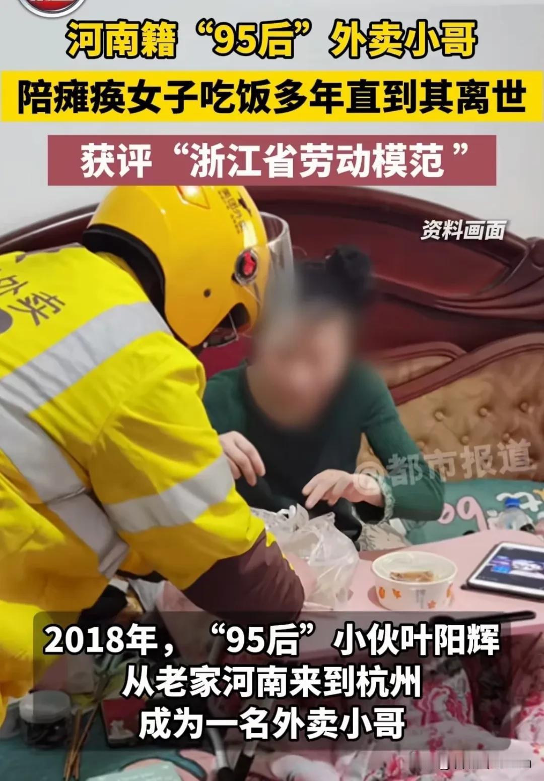 有位老家的河南的外卖小哥,在杭州送外卖。每次给一位瘫痪的女子送餐后,关闭订单花费15分钟帮女子吃完饭,收拾好顺手带走垃圾。整整坚持了1000多天,直到女子离世! 这个小哥叫叶阳辉,生在河南信阳的村子里,跟着在外打工的爸妈到杭州送外卖。改变他的那个订单,是当年夏天的一个中午——订单备注写着“别放门外,敲门进来”,这是他跑单以来头一回见有人让外卖员直接进屋。 推开门时他愣了:老小区的小屋里光线发暗,床上的计大姐(计旭莺)脸色发黄,正撑着床沿使劲想坐起来,两只手攥得发白也没成功。 叶阳辉赶紧放下外卖扶了一把,这才知道大姐是小脑萎缩瘫了七年,家人白天要上班带孩子,只能靠点外卖果腹,连打开餐盒都费劲。 那天他没急着走,掏出手机关了接单系统,站在旁边等大姐慢慢吃完,收拾好餐盒,把床头堆着的垃圾一并拎下了楼。 外卖骑手的时间是按秒算的,关15分钟接单系统,意味着高峰时段少送两三单,一天下来收入能差几十块。可叶阳辉没算过这笔账,后来再看到计大姐的订单,他会盯着手机抢——哪怕手里还有顺路单,也会先把其他单送完,留着这一单最后去。 爬四楼没电梯,夏天工服拧得出水,他会先在门口擦把汗再推门;冬天雨夹雪裹着寒气,他把外卖捂在怀里,等餐暖一点再递过去。大姐不爱说话,吃完只会小声说句“谢谢”,可就这两个字,让叶阳辉觉得这15分钟比多跑几单都值。 他知道自己抢不完所有订单,就把计大姐的情况发到了骑手群里。没成想群里炸了锅,100多个平均年龄不到25岁的小伙子,没人犹豫,都说“这事儿该帮”。 从那以后,不管谁接到这个地址的单,都会自动关了接单系统——有人会顺手带瓶水,有人会帮着整理下床边的杂物,哪怕站点午高峰订单能堆到一千多单,也没人把这单转出去。站长后来才知道这事儿,只说“这群小伙子,心都是热的”。 这一陪就是四年多,叶阳辉自己给计大姐送了快500次外卖。 后来他觉得这股劲儿不能散,就在塘栖镇成立了“叶阳辉志愿服务站”——午高峰过了,他带着骑手们上门看高龄老人,帮着擦桌子扫地;古镇游客多的时候,他们摆个摊宣传反诈和垃圾分类; 遇到独居的残障人士,骑手们会主动把送餐的“15分钟陪伴”延续下去。他上了“中国好人榜”;五一,他捧着“浙江省劳动模范”的证书站在人民大会堂里,领完奖转头就回了塘栖——假期游客多,他得赶紧回去跑单,“靠力气挣钱,心里踏实”。 有一天,叶阳辉两周没接到计大姐的单,问了社区才知道,大姐已经因病走了。他没多说什么,只是默默去大姐原来的住处看了看,那些他拎过无数次的垃圾袋,如今再没了需要带走的理由。难过是真的,但他更清楚:大姐最后这一千多天里,每顿饭都是热的,身边从没缺过愿意等她的人。 没人觉得叶阳辉做的是“大事”——他只是个初中毕业就出来闯荡的外卖小哥,没读过多少书,也说不出漂亮的大道理。 可就是这个普通到不能再普通的年轻人,把“不忍心”变成了一千多天的坚持,又把一个人的坚持变成了一百多人的接力。这不是什么“刻意的善”,是看到别人难,就忍不住伸手的本能;是明明自己挣的是辛苦钱,还愿意匀出15分钟给陌生人的热乎气。 这些骑手们没想要什么表彰,却在不经意间把“普通人的善意”活成了最实在的样子——不是惊天动地的壮举,是一饭一陪的温暖,是一群人的接力里,藏着的最朴素的好。 各位读者你们怎么看?欢迎在评论区讨论。