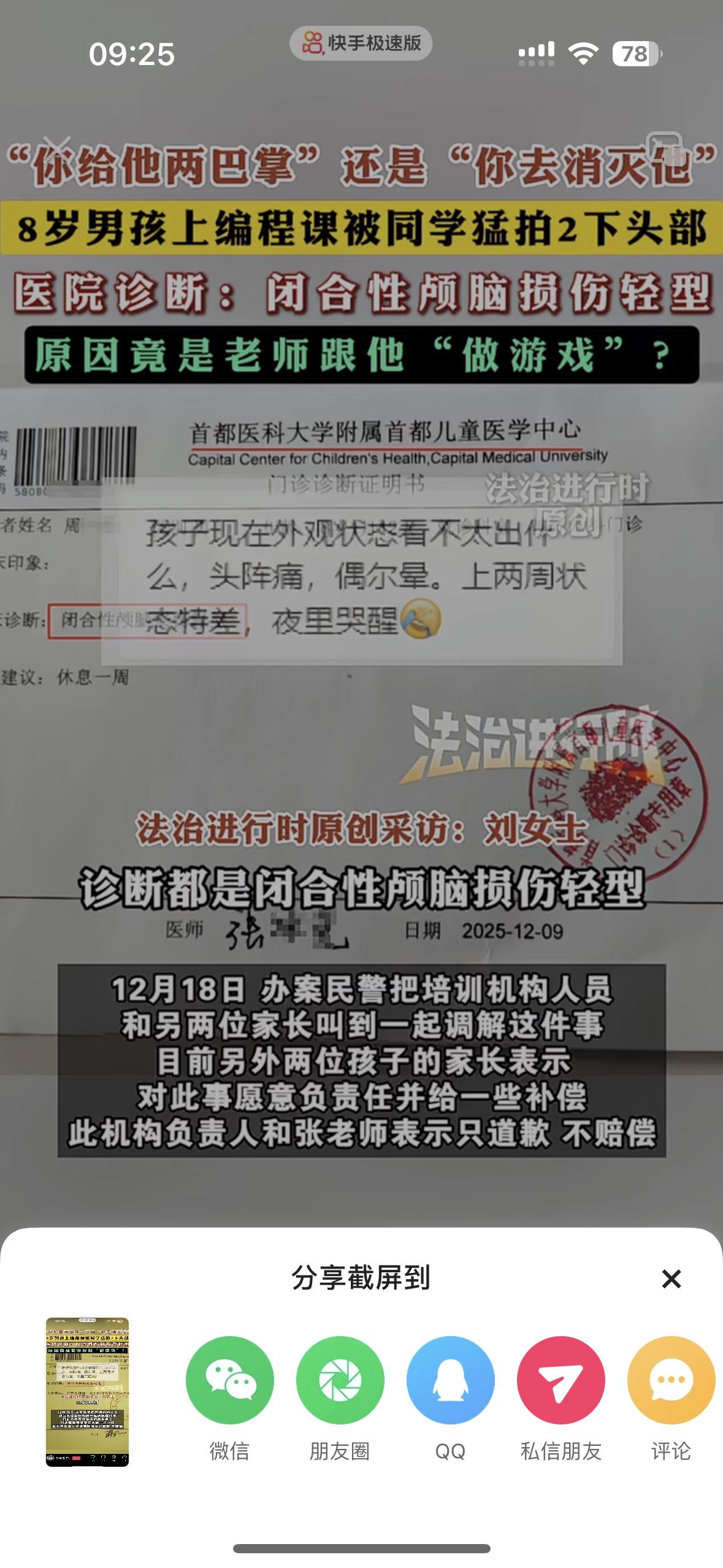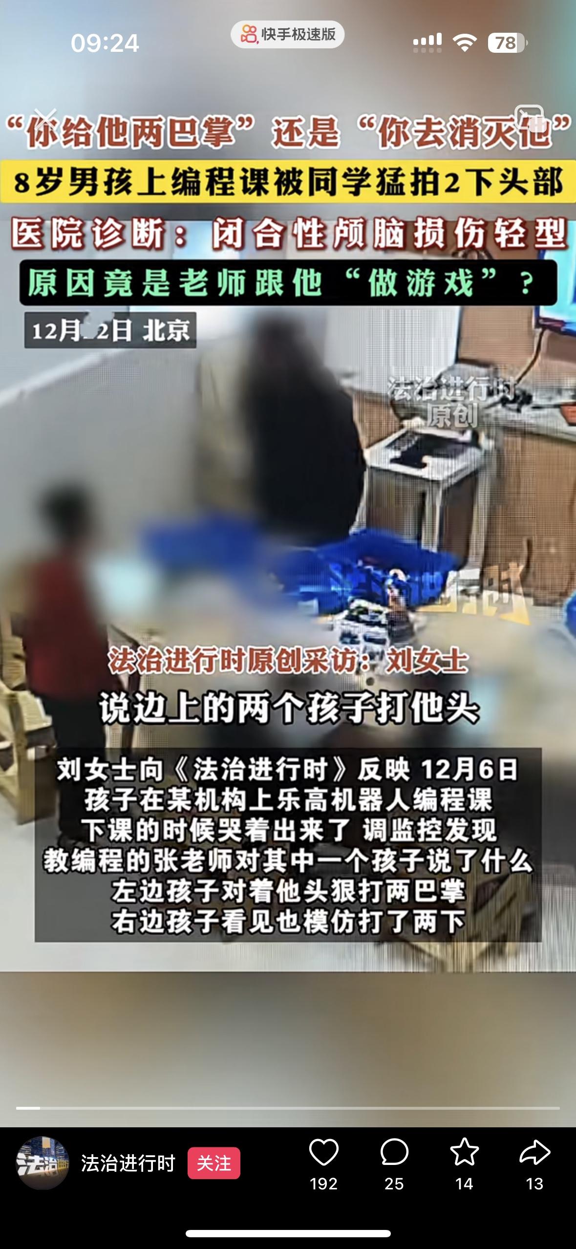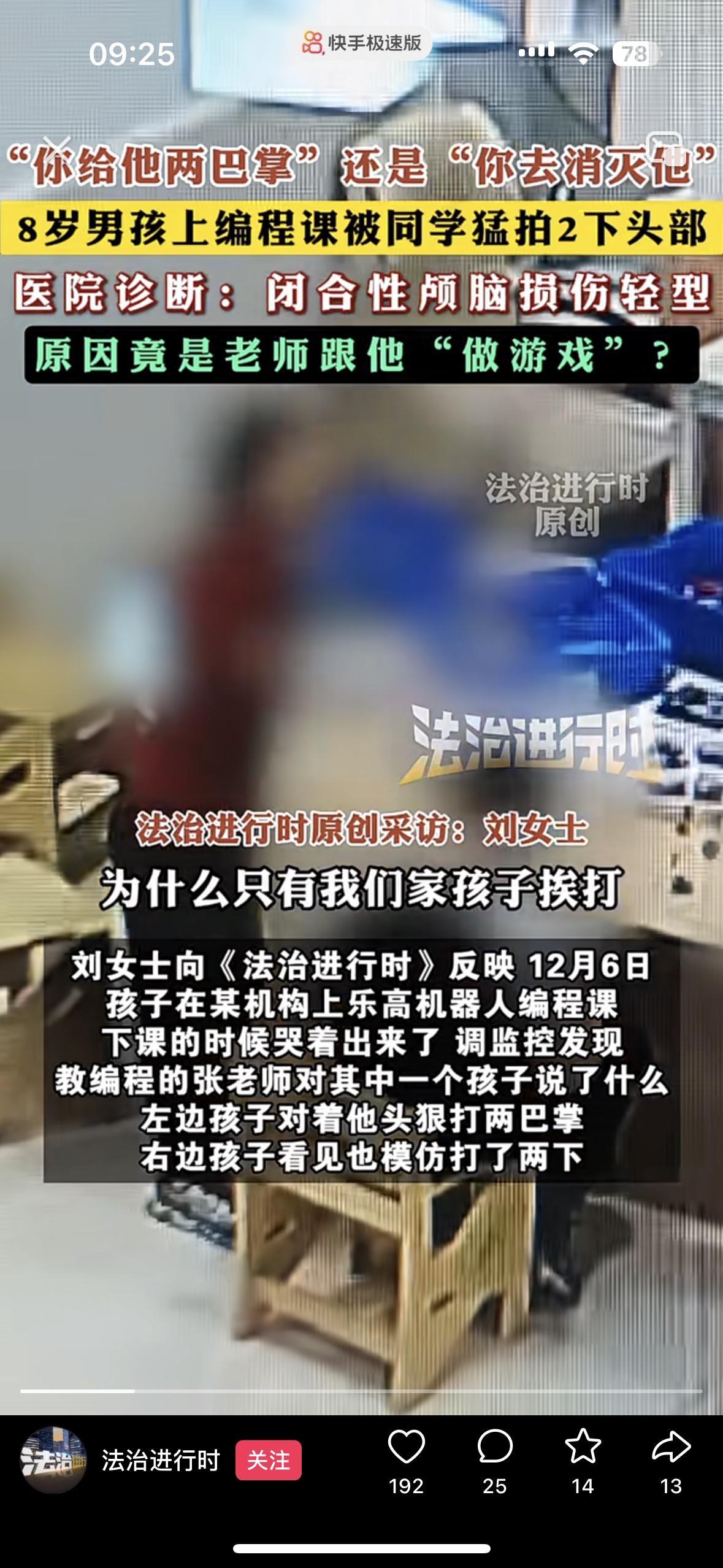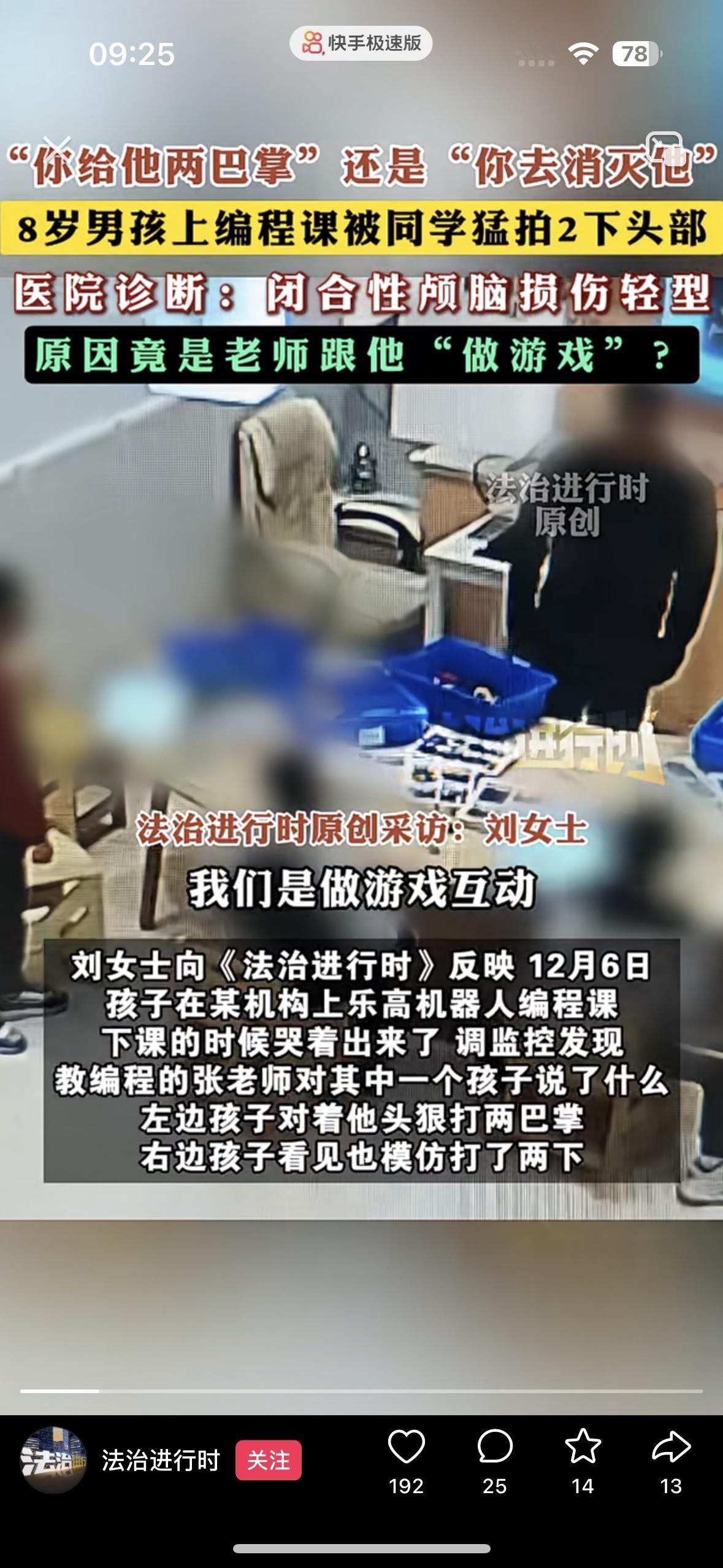 这老师摊上事了!孩子哭着和家长说在编程课上有2个同学打他的头!但老师却一口咬定说是在做游戏互动,既然是游戏互动,为啥只有自己家的孩子挨打了呢?于是家长查监控看到,老师对一个孩子说消灭他!他就对着自己家孩子的头狠狠打了2巴掌,另一个孩子也同样模仿他给了自己家孩子2巴掌! 老师其实是因为孩子的机器出声音,就让旁边孩子打了他!没想到被打出了闭合型颅脑损伤轻型!两位孩子的家长表示愿意赔偿,可机构的负责人和老师却只道歉不赔偿,难道不是老师的问题吗?这样的态度真的让人愤怒