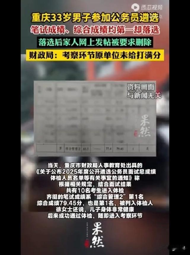 重庆33岁男子参加公务员遴选,以“笔试和综合成绩第一”的优异表现一路过关斩将,连体检也顺利通过,最后却被告知“不予录用”! 而用人单位给出的理由,更是让人无法接受…… 据称,该次招录原计划录用10人。在考察环节中,其他入围者都从原单位获得了满分评价,唯有这位男子没有拿到满分。 仅因原单位未给满分就直接淘汰综合第一的考生,这样的决定是否过于主观? 考察评价本应全面、客观,仅因一分之差就否定一个人的所有努力,招录政策的公平性和严肃性何在? 更何况,未打满分并不代表不称职,仅凭这一条就剥夺录用资格,理由实在牵强。 更令人不解的是,当事人反映问题也受阻,新用人单位要求他们删除在网上发布的视频反映,甚至跑到单位对他进行解释,是否有些过于强硬? 但最让人心疼的还是这名考生,体检通过、新单位已来考察,整个选拔过程几乎人尽皆知,最终却莫名落选。 周围的议论与猜测随之而来: 是不是在原单位人缘不好?是否存在不端行为?…… 种种未经证实的传言,不仅令他无缘新岗位,也可能让他在原单位陷入舆论困境,未来发展蒙上阴影。 一场本该公平的选拔,为何变成这样?当程序正义被细节悬置,个人的努力又该如何安放?