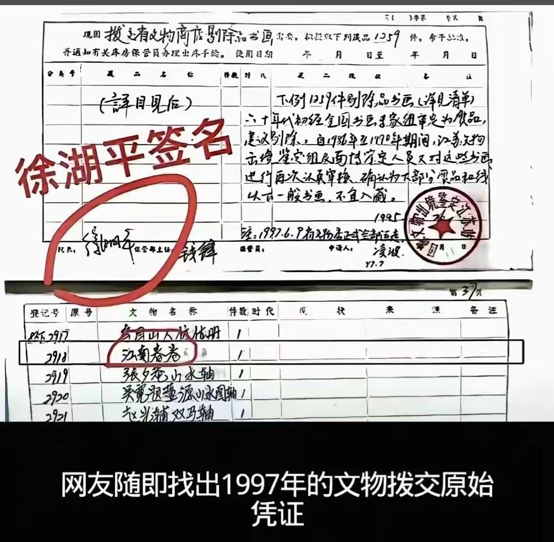 80多岁的徐湖平,已经退休多年的他,被自己的老员工实名举报了。 举报他的是前南京博物馆的典藏员工。 这个员工,看着也是退休人员,已经是白发苍苍的老人。 他手持身份证,实名举报前馆长徐湖平。 这《江南春》刚从拍卖场撤下,风波却越滚越大。 82岁的前院长徐湖平被曝遭42人联署举报,离休老同事在视频里指认其“六宗罪” 没想到啊,徐湖平卖惨不成 结果反而是越抹越黑。 看来,他的晚年好日子到头了。 前南博典藏部员工在网上手持身份证发布视频,实名举报徐湖平。 举报者说,徐湖平在任南京博物馆馆长的时候,他将文物鉴定为赝品,在低价出售到文物商店。 那一幅仇英的《江南春》画,就曾经是徐湖平的手笔签字放行的。 不过,耐人寻味的是,当年的人事关系中,这徐湖平是南京博物馆的馆长,同时还是那家文物总店的法定代表人。 也就是说,当初这幅画,调出方的“签字人”是徐湖平,接收方的“掌柜”也是徐湖平。 也就是说,徐湖平从左手倒到右手。 从国家的博物馆,倒到自己家的文物店。 令人难以置信的是,这副《江南春》画,先是被一名叫做顾客的人,以6800元买走。 签字放行的就是这徐湖南馆长。 现在,这一幅画在北京的拍卖场出现,拍卖价是8800万元。 细思极恐,粗思也恐,不思也恐。 从博物馆转手到拍卖公司,这个价位大的数目令人吃惊。 想一想,文物店是他们家的,这个拍卖公司也在他儿子的名下。 这一番神操作之后,就把曾经的文物据为己有。 这位82岁的南京博物馆前馆长有点意思。 虽然他现在已经退休多年,但是做过的事情不可能没有痕迹。 人过留名,雁过留声。这签字盖章骗不了人,不是假的。 不管年龄多大,做人要为自己做过的事负责。 现在,南京博物馆的退休人员实名举报他有问题。 即使他已经80多了,已经退休多年了。 也依然逃脱不了责任。 他许湖平做过的事情,还是要负责的。 有句老话说的好,要想人不知,除非己莫为,伸手必被捉。 把国家文物占为己有,可不是小事一桩。 你说这徐湖平是这种人吗?