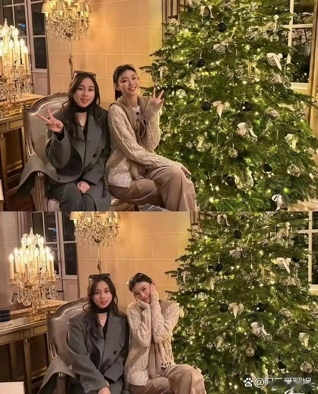何超欣晒出和嫂子奚梦瑶的合照,两人打扮都很精致,在圣诞树前开心比耶。姑嫂两人感情