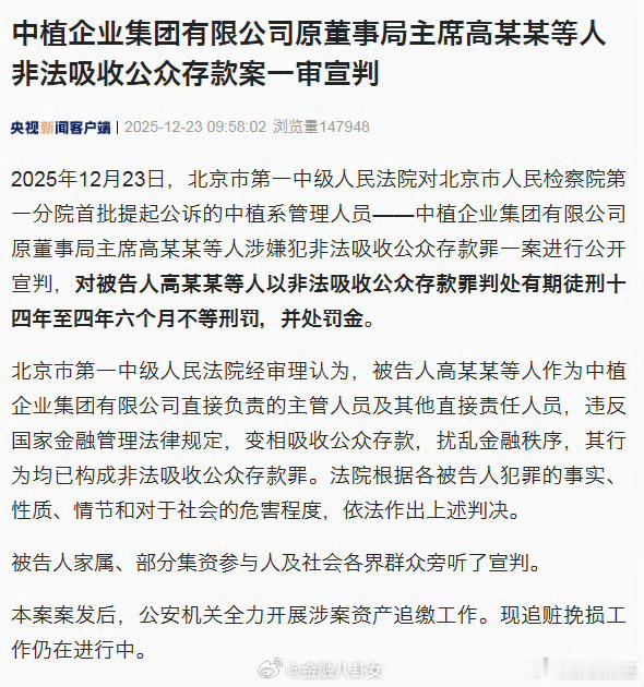中植企业集团有限公司原董事局主席高某某等人非法吸收公众存款案一审宣判