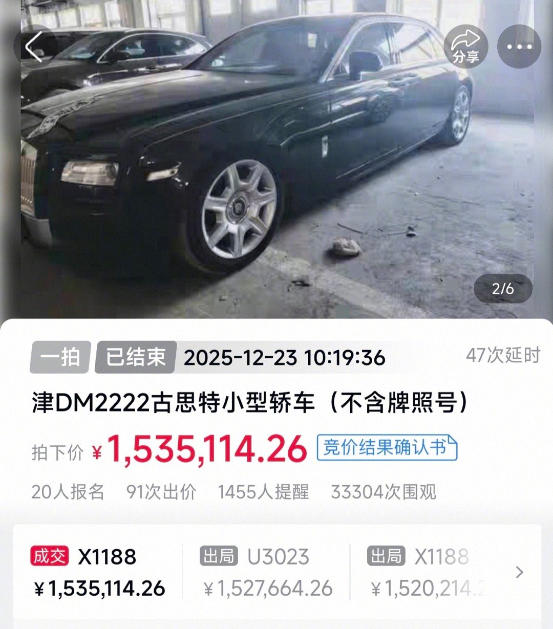 【#津DM2222古思特74.5万起拍153.5万成交#】#津DM2222古思特拍出153.5万不含车牌# 12月23日,记者从拍卖平台了解到,一辆车牌为津DM2222的古思特小型轿车成功拍出。该车起拍价745414.26元,评估价1064877.5元,最终拍出1535114.26元。值得注意的是,此次拍卖并不包含车牌。记者从天津市和平区法院发出的执行裁定书看到,此次拍卖涉及一起金融借款合同纠纷,因被执行人陈某未履行还款义务,依法查封其名下津DM2222古思特小型轿车。(大皖新闻记者 朱庆玲)