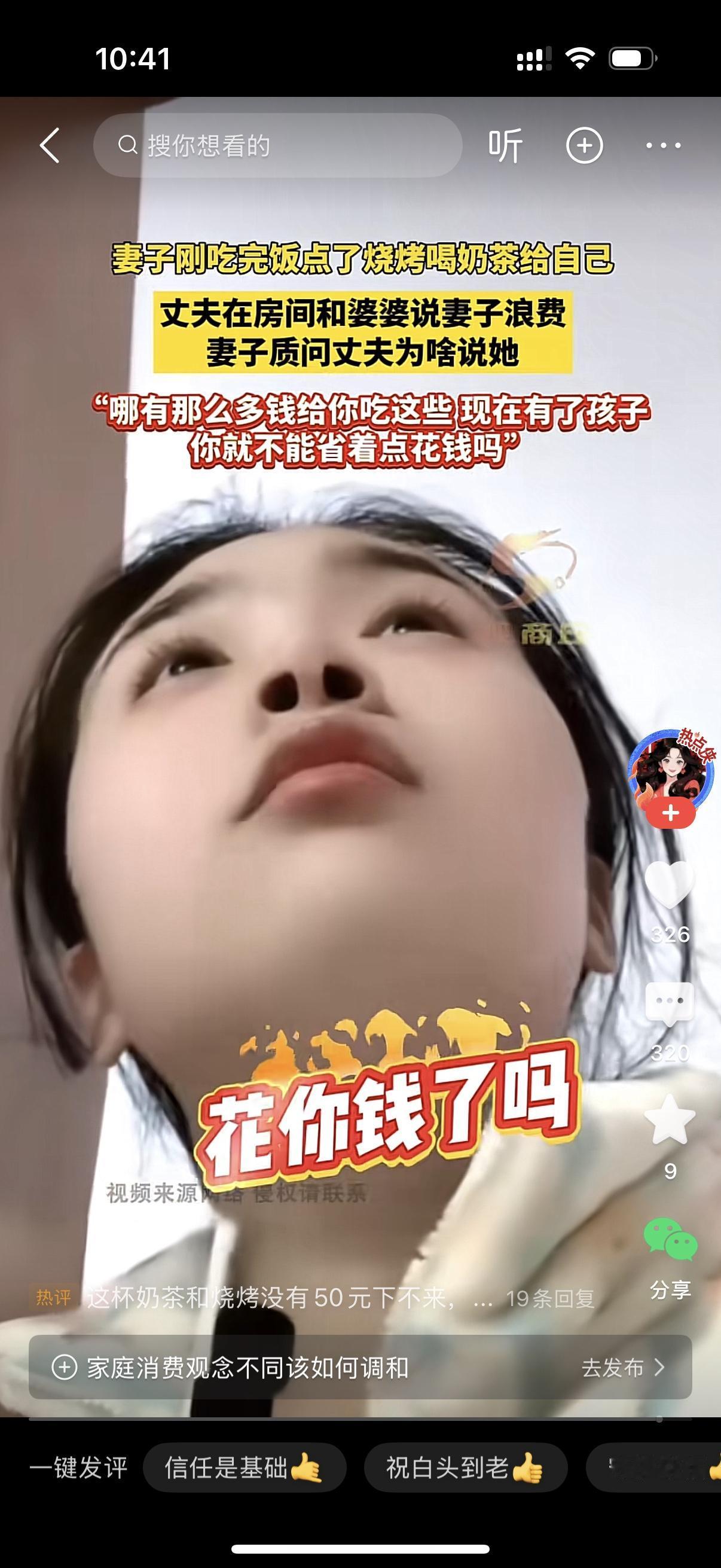 妻子刚吃完饭,又给自己一个人点了烧烤和奶茶。丈夫和婆婆在房间里说妻子浪费。妻子听到了,质问男人为啥说她?丈夫也不藏着掖着了,吼妻子,你刚吃完饭又是烧烤又是奶茶,现在有孩子呢,哪有那么多钱让你花?妻子直接怼男人,花你钱了吗?男人很无语,你的钱不都是我给的吗?女人真是奇怪,明明花着男人的钱,却还嘴硬的很。