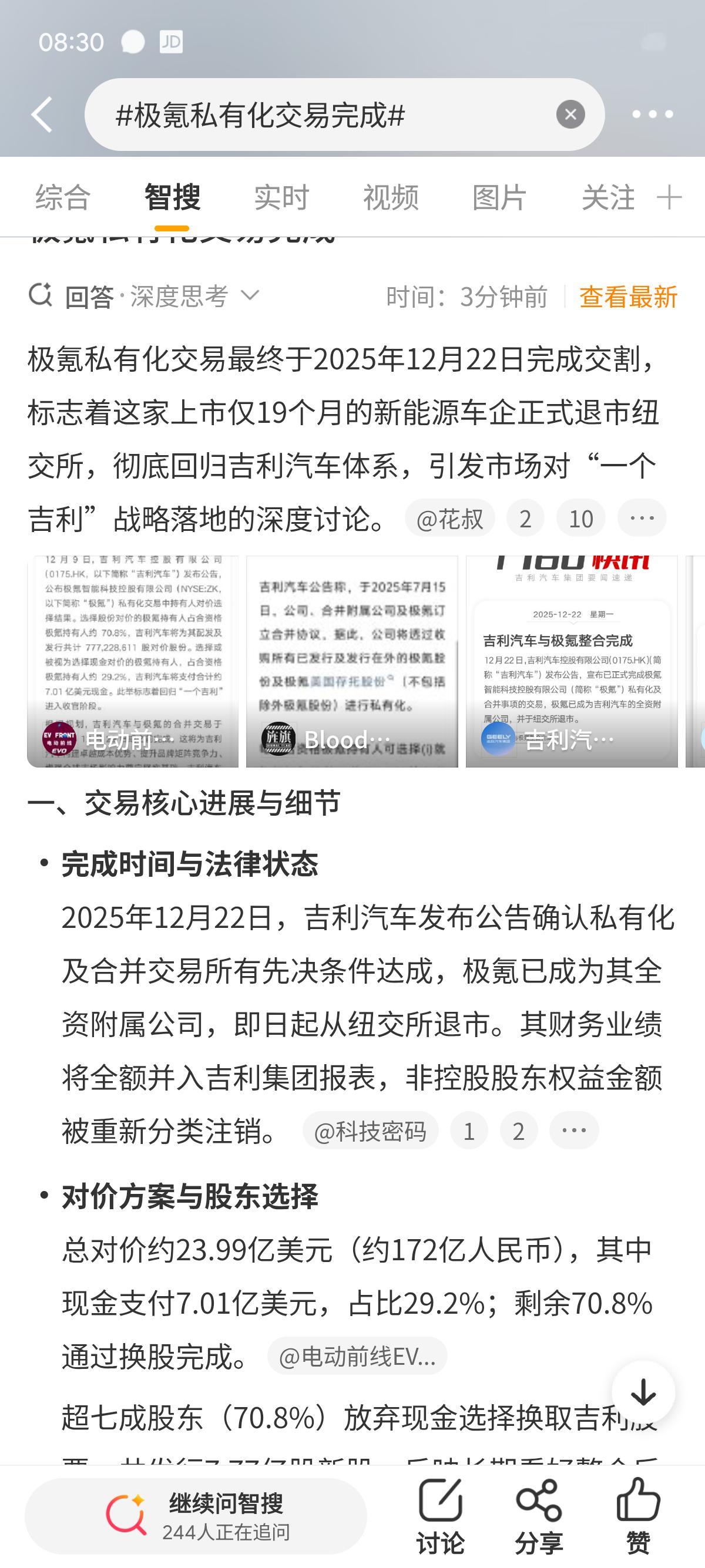 极氪私有化交易完成极氪和领克的“重整”工作折腾很久了,赶紧完成布局,让团队稳定下来,开始干活吧。车圈竞争激烈,产品迭代非常快,没有多少时间可以浪费