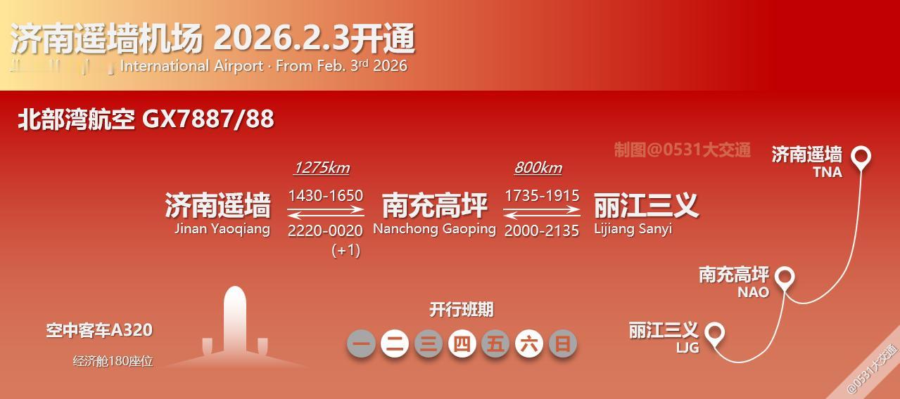 2026年2月3日起,北部湾航空开通GX7887/88济南遥墙-南充高坪-丽江三义晚班航线,全经济舱空客A320执飞,每周二四六开行[奸笑][奸笑]。本航季西藏航空原拉萨-南充-济南航线调整为拉萨-南充-扬泰/北海,济南与南充间航线处于断航状态,北部湾航空的新增航线将补充南充航线的空白;此条航线并非北部湾航空首次开行济南-南充航段,2017年前后北部湾曾经开行济南-南充-南宁航线[吃瓜群众][吃瓜群众];而济南-丽江航段北部湾航空此前未曾执飞,新航线开通后,济南-丽江间的航线将达到每日3-4班[惊喜][惊喜]。从时刻排班来看,开通济南-丽江航线大概率要停飞济南-赤峰-霍林郭勒航线,当然也可能是通过调整济南-榆林航班的时刻或者增加驻场飞机来执飞此条航线[无辜笑][无辜笑]