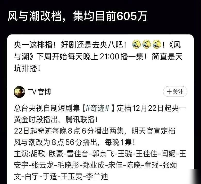 我人傻了,正追着任嘉伦的《风与潮》,央一黄金档突然就给挪了。 谁能想到正看到关键时刻,这部讲澳门往事的大剧竟然被调整到了次黄档,听说是为了给胡歌接档的新剧《奇迹》腾地方。 其实这剧的电视收视表现一直挺稳,甚至还帮央一下半年拉回了不少分数,但反观网络数据就显得有点尴尬。 我看了一下,集均605万的网播量在现在的环境下确实不算亮眼,这大概也是平台不得不考虑的现实。 但我更在意的是这剧的内核,它讲的是何贤、马万祺这些先辈的真实创业史,这种厚重感其实很难用单一的流量去量化。 现在这种“挪位”的操作一出来,总感觉大家好像都在盯着数据看,反而忽略了那些真实人物自带的感人力量。 说白了,电视台的排播逻辑可能更倾向于话题度和爆发力,毕竟黄金档的位置确实属于兵家必争之地。 只是觉得有点可惜,这种正儿八经讲历史、讲情怀的好故事,如果因为网播数据不够“爆”就得让路,确实挺让人唏嘘。 以后在央视追剧真的得随缘,心态放平最重要,只要故事本身立得住,换个时段看其实也行。