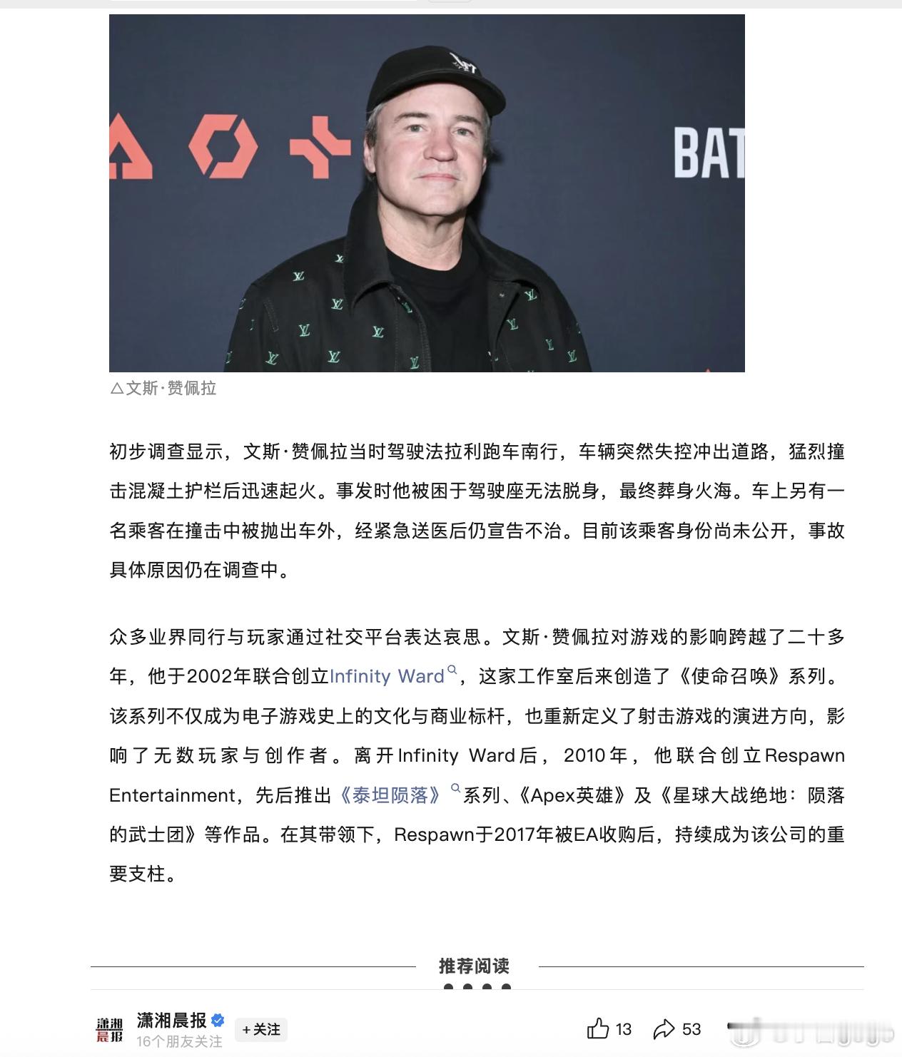 《使命召唤》游戏制作人文斯·赞佩拉驾驶法拉利失控撞栏,车辆迅速起火被困后,人没了...道路千万条,安全第一条啊...