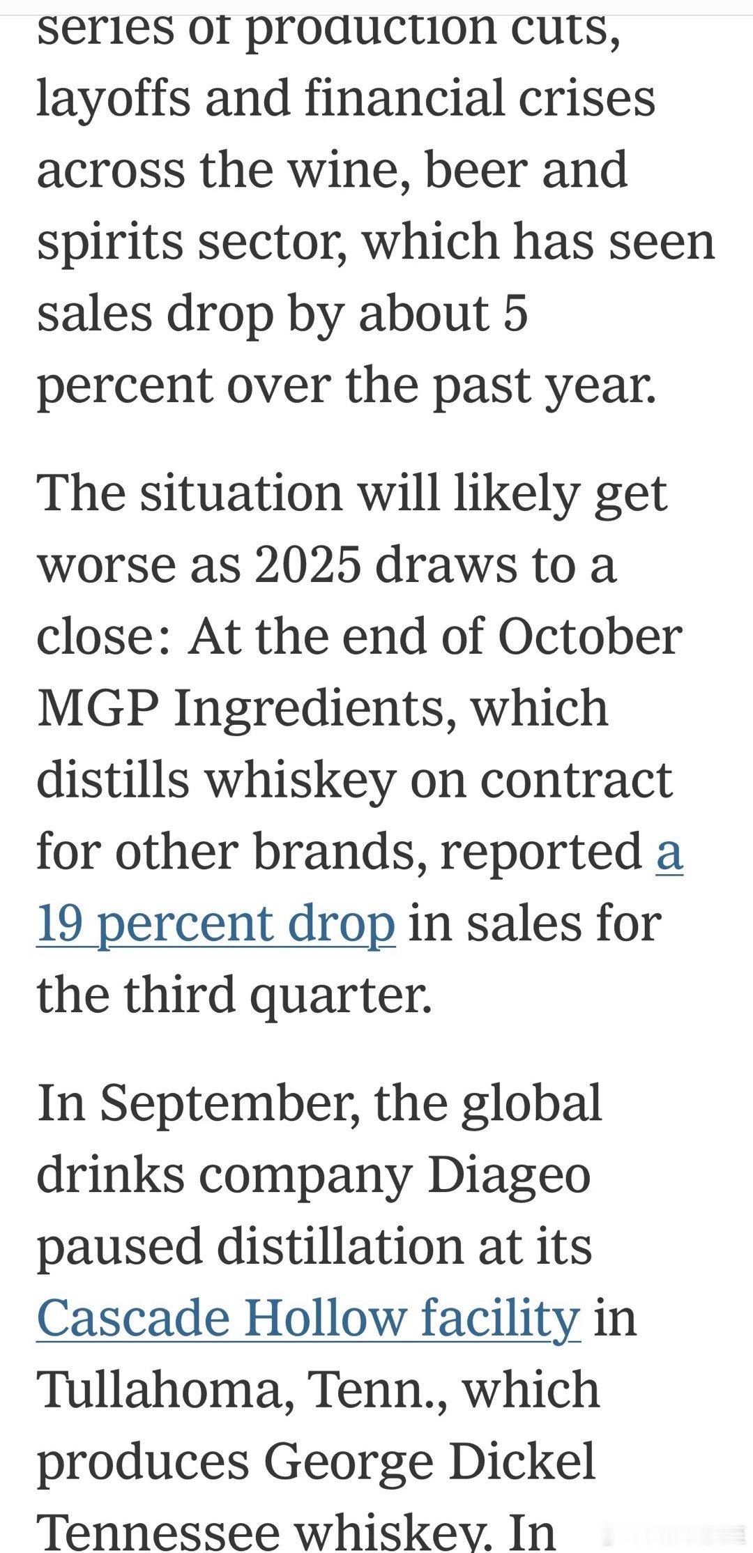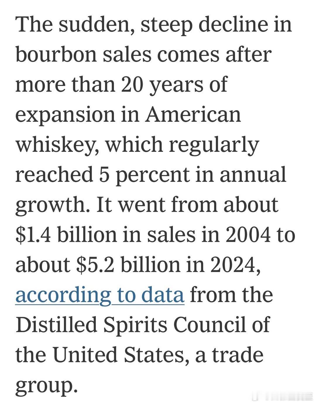 美国威士忌,2004-2024,年销量从$14亿涨到$52亿,年增经常达到5%今年以来,烈酒行业,销量降低5%,有的品牌暴跌近20%面对需求疲软,减产、裁员很多著名的Jim Bean宣布:肯塔基州酒厂,2026全面停产(年产九百万加仑的规模)