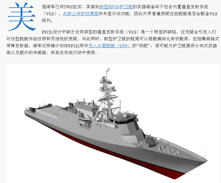 由于很多美国军迷对于新型护卫舰不配垂发感到难以置信,所以《战区》网向美国海军进行了求证,得到“首批新型护卫舰不会配备内置垂发”的确认。