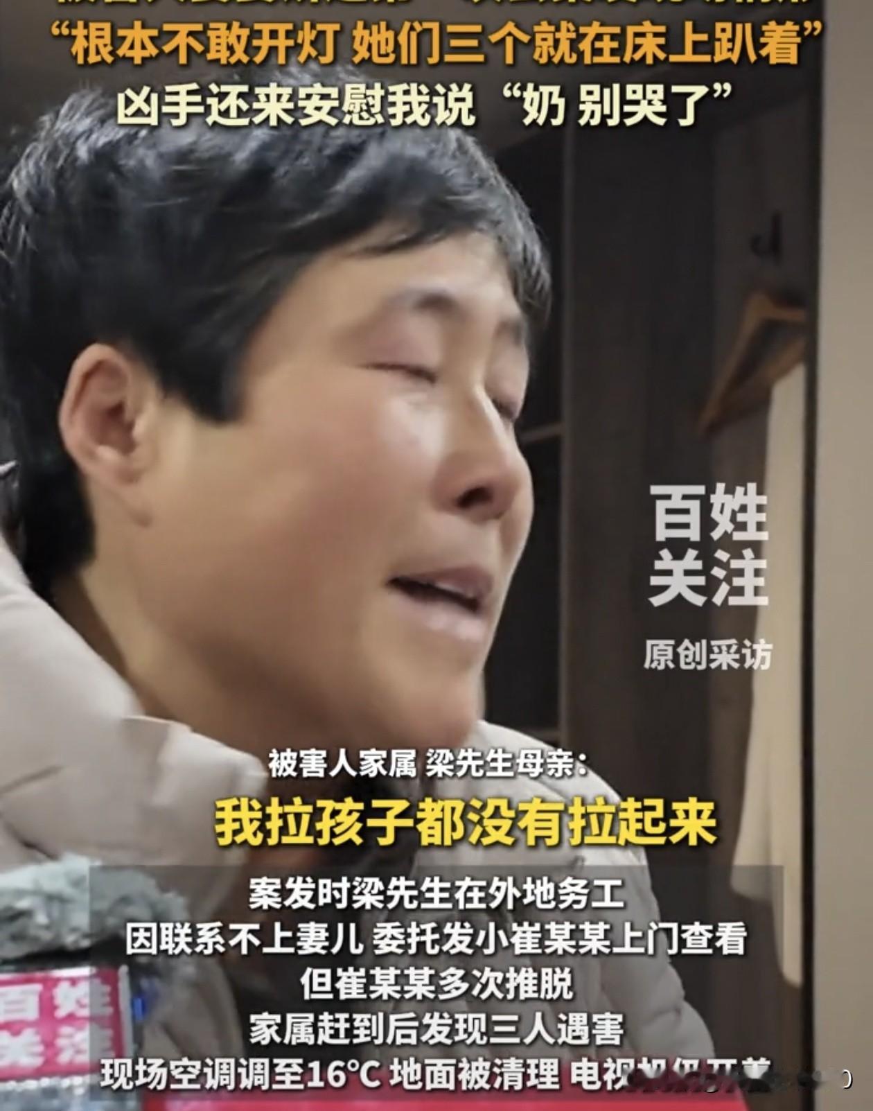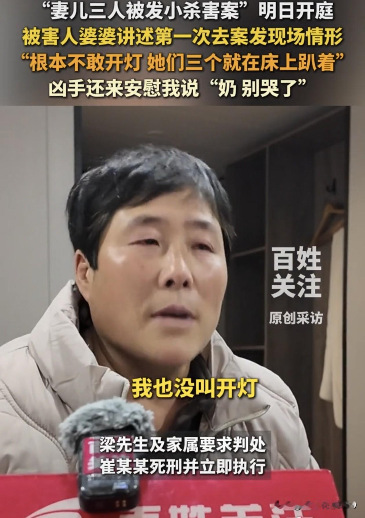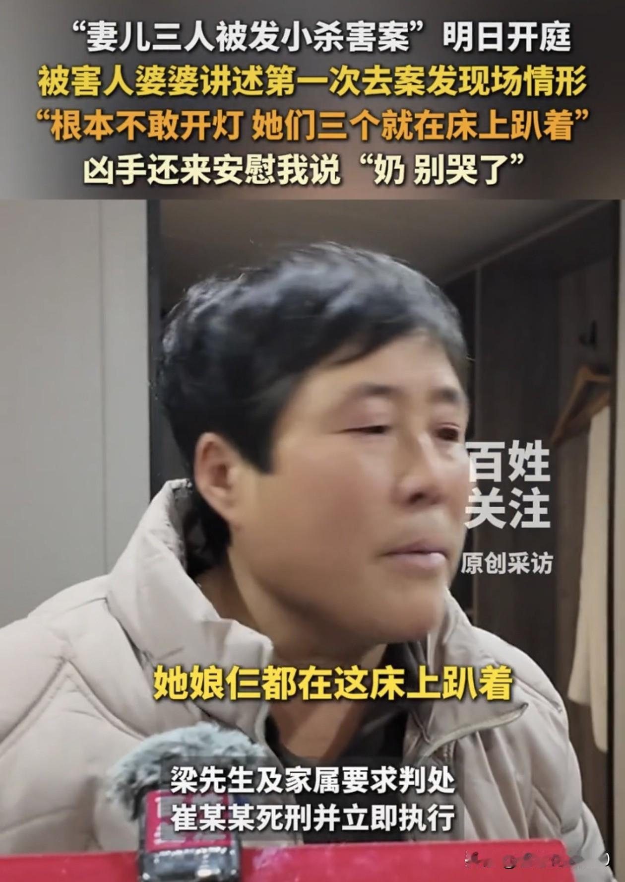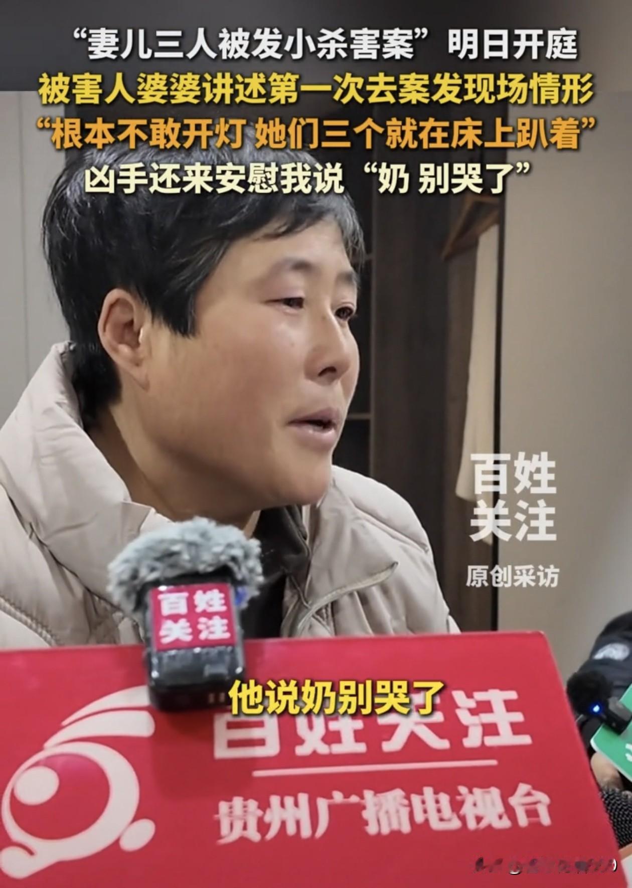 河南郑州中牟县的“妻儿三人被发小杀害案”今天开庭了。被害者婆婆讲述更多细节,其中一点说明了凶手的心理非常强大,装没事的样子。 据受害者婆婆计述,她第一次去案发现场时,是走在最前面的,拉孩子都没有拉起来,一看是这肠子都出来了。但是脸都没有看出来,娘仨都趴在床上。虽然她是走在最前面的,但是她没敢开灯,可是孩子的外婆把灯打开了,她立马打灯又给关了,怕看了以后根本走不出去。下楼后看到嫌疑人时,嫌疑人甚至还安慰她说“奶别哭了”。 这心理真的是强大,还能装作没事的样子,回到案发现场。想来其中一点是作为发小过去关心一下;还有一点应该是作案的人,往往会返回案发现场,看警方的调查动向。 真的是不敢想象,孩子妈妈看到两个小孩在自己面前被熟人杀害时的绝望,那是有多痛苦。 盼着能有一个公正的判决,告慰逝者,也给所有牵挂这件事的人一个心安的结果。