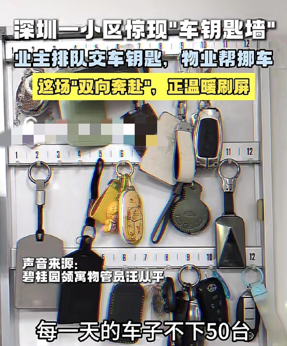 深圳一小区出现了一面车钥匙墙,住在小区里的业主们,车钥匙都各自挂在了墙上。原来这里的物业大叔每天会帮忙业主们挪车,很多业主下班回来停车不方便,有时候车位紧张的时候,这位大物业大叔会主动的帮业主把车子停好,每一位业主的车子车牌座位,大叔都记得很清楚,对于业主们来说事很欣慰的,每天停车这件事就节省了不少的时间和烦恼,但是对于把大叔来说,他也是很辛苦的,但是他觉得这样可以给业主们带来更好的服务。这种双向奔赴,只能说可遇不可求。
