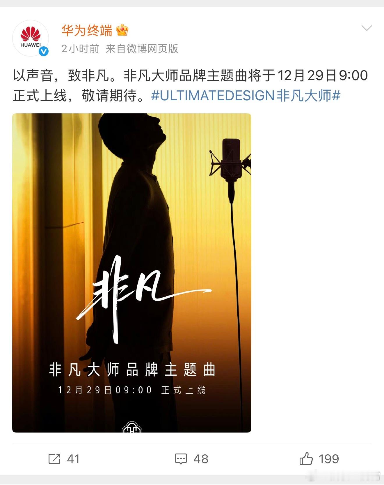 没想到吧,华为将发布非凡大师品牌主题曲,非凡大师品牌主题曲《非凡》将于12月29日9点正式上线。确实,刘德华多年来对专业的坚守和非凡大师品牌所追求的极致、敢于创新的内核非常契合,这也是为什么选择华仔的原因所在,从科技圈到影音圈,华子总能玩出点新花样,当然我已经开始期待天王的嗓音搭配华为的质感了,我猜这首歌会像《Dream it Possible》一样出圈,拭目以待