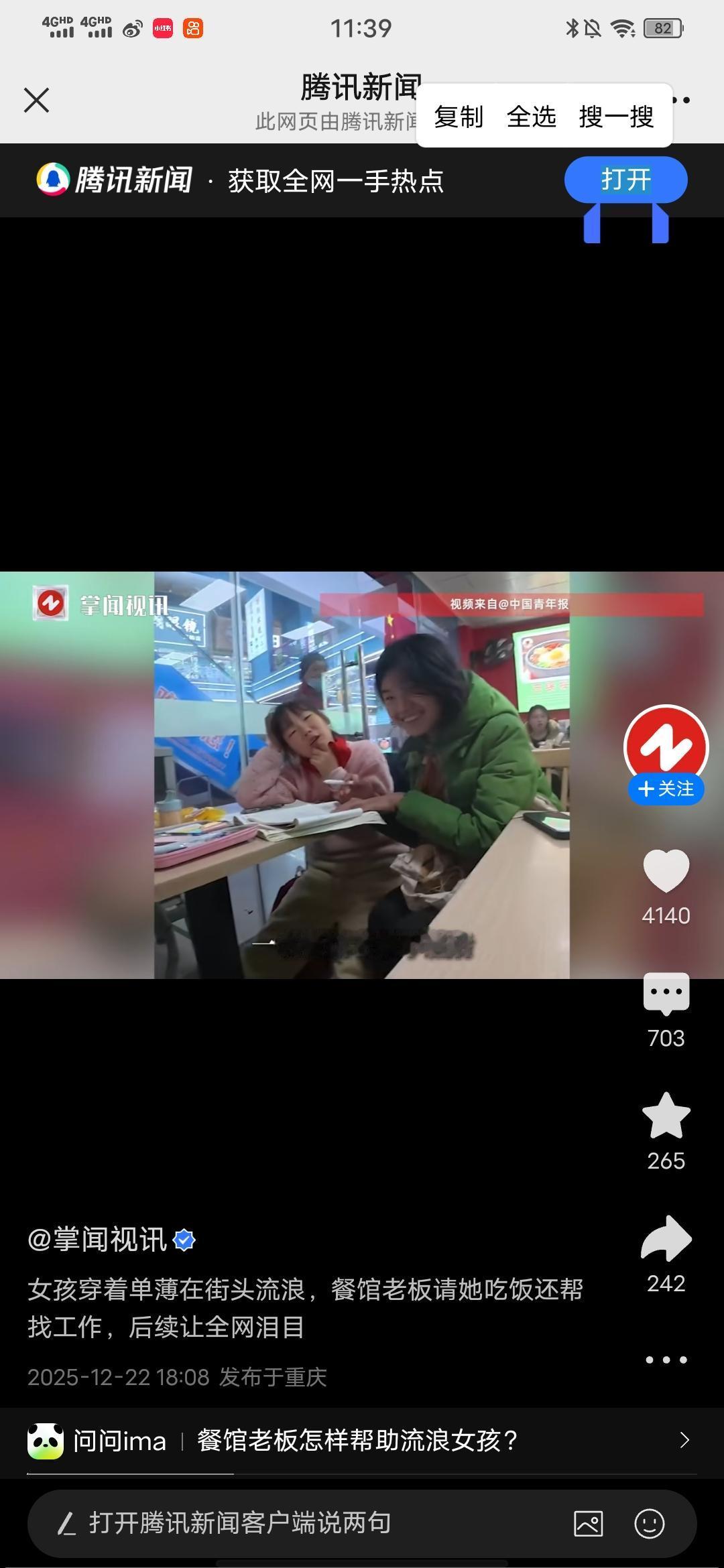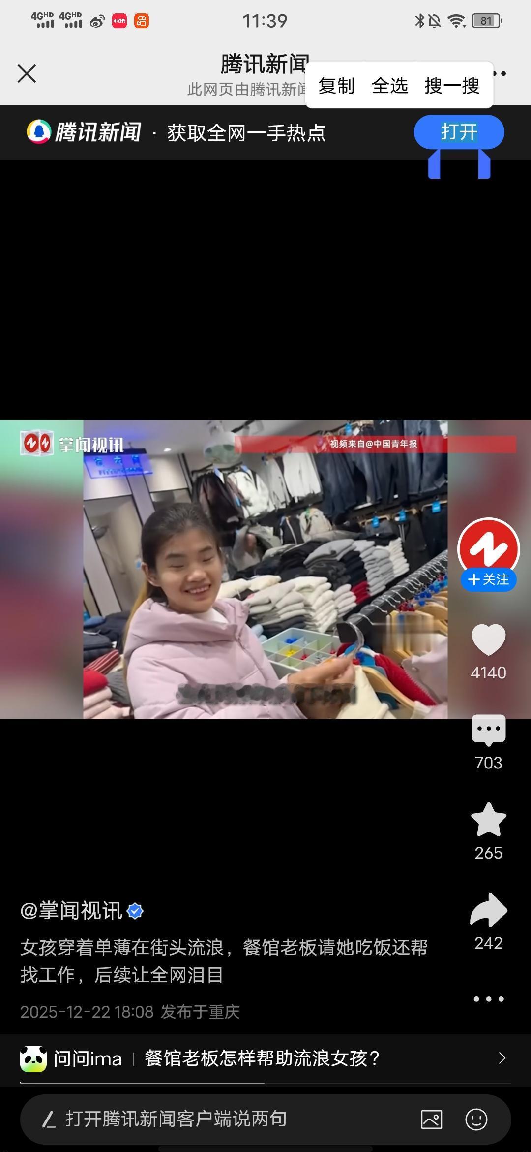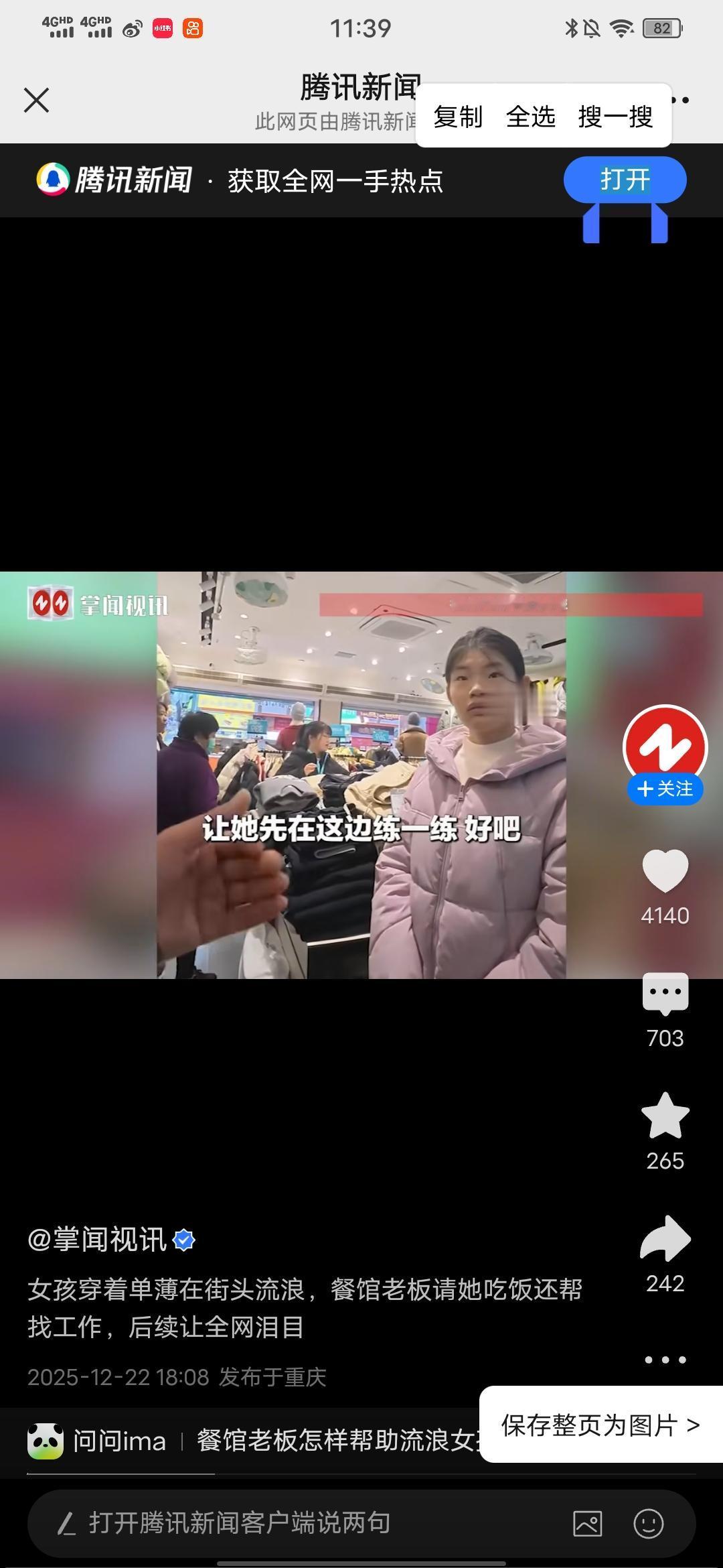 女孩穿着单薄在街头流浪,餐馆老板请她吃饭还帮找工作,后续让全网泪目! 刚在掌闻视讯看到的这个消息,一个19岁的女孩,凌晨了还在街头流浪,一个开餐馆的老板发现她大冬天的,衣着单薄,便带她回店里,请她吃饭,然后还帮她补办身份证,给她找包吃包住的工作,还给她买衣服和生活用品,有卖衣服的老板说:你爸对你真好,听到别人这样说,女孩忍不住掩面哭泣。 因为她的父母早早离异,在她高中时他父亲就不再管她了,只能辍学,而且她被迫在姑姑家长大,靠打零工生活,前一份工作还被拖欠工资。从来没有遇到这么温暖的叔叔,在这位好心叔叔的帮助下,她开始了新的生活,还拿回了之前被拖欠的工资。小女孩也是懂感恩的,还买东西去看望帮助他的这位好心的老板。 这个故事真的很感人,很温暖。不过她的父母该被谴责,好在命运让他遇到了好心人,希望她以后的日子能越来越好吧!