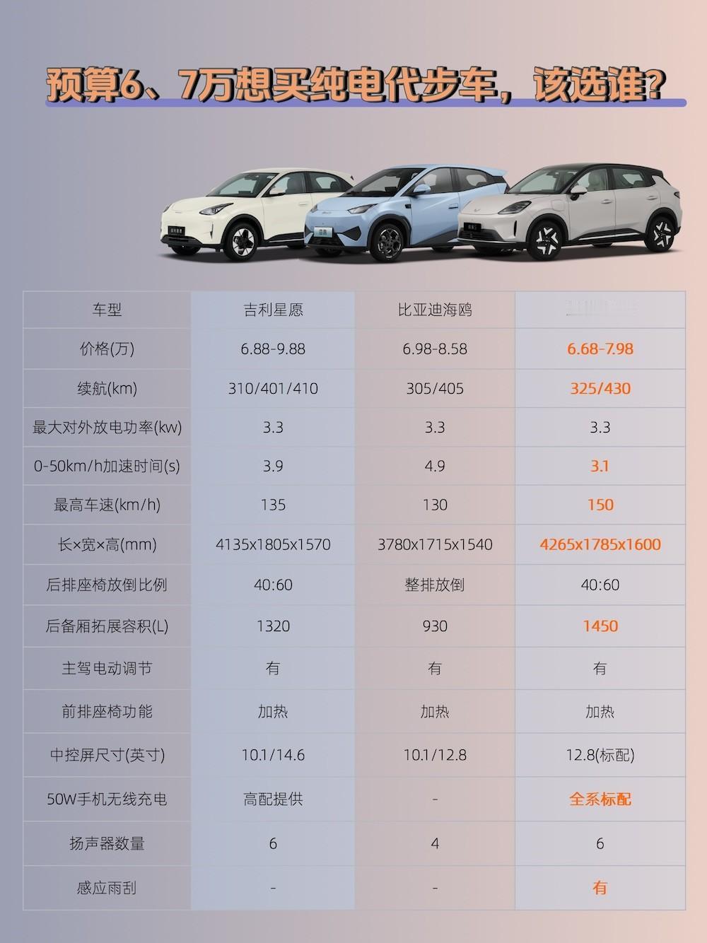 6、7万预算买纯电代步,星愿、海鸥、缤果S,怎么选? 现在的纯电代步选择是越来越丰富了,可这选来选去,真要说靠谱且好用的,还得看大厂,比如吉利的星愿、比如比亚迪的海鸥,还有五菱的缤果S都是不错的产品。这三款都是6、7万预算就能拿下的,你说该选谁? 纯电代步前提当然是续航,三款里,最长的是缤果S,430km纯电续航对比410km的星愿、405km的海鸥,充一次电,相比之下大概能多开一天。 除了续航,空间也是很重要的。缤果S与星愿都有5座布局,而二排座间距达到882mm的缤果S确实会更宽敞些。同时,缤果S与星愿的后备厢也有更强拓展性,比起只能整体放倒二排的海鸥,它们两位都支持比例放倒,1450L的缤果S与1320L的星愿,都能满足家庭应急运输或是自驾露营放大件的需求。 能看到的是,三款车都可获得主驾电动调节+前排加热,不过,缤果S与星愿都可获得50W无线充电、6扬声器,其中,缤果S还是标配,入门就可以享受。 说到标配,缤果S的12.8英寸中控屏也是全系共享,而星愿、海鸥入门都只有10.1英寸屏,更何况缤果S还用的Android 13系统、支持灵语AI+DeepSeek大模型,这也符合年轻人的使用习惯。