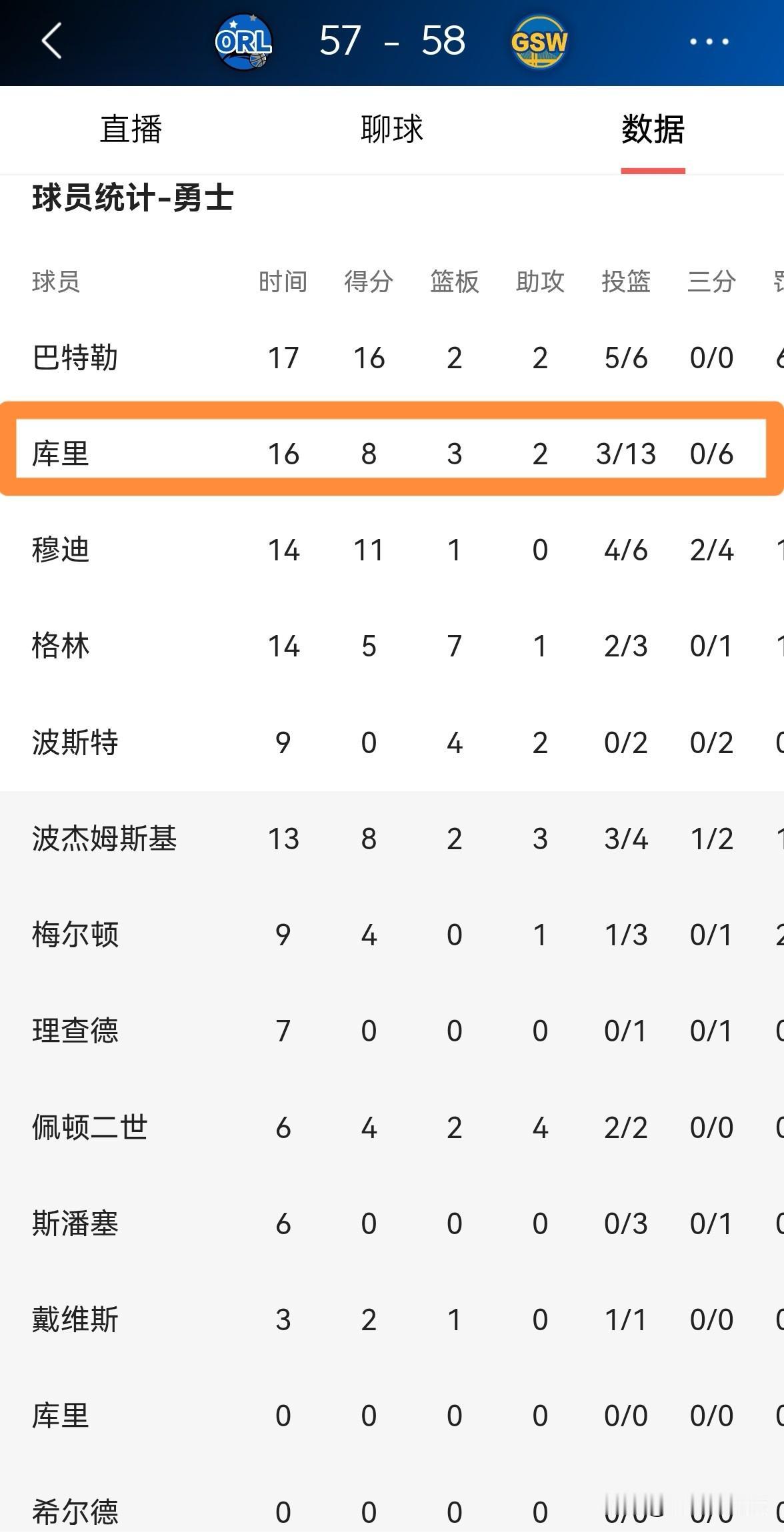 NBA历史三分王库里真是让人失望至极!在今天勇士主场迎战魔术的比赛中,目前双方半场战罢,勇士以58:57领先对手。在前两节比赛中,库里的三分手感异常冰凉,他在首发出战的16分钟里,投篮13中3,其中三分球6中0、罚球2中2极其低效的得到8分。 试问作为NBA历史上的三分王,当库里投不进三分球的时候,他还配得上这样的美誉吗?