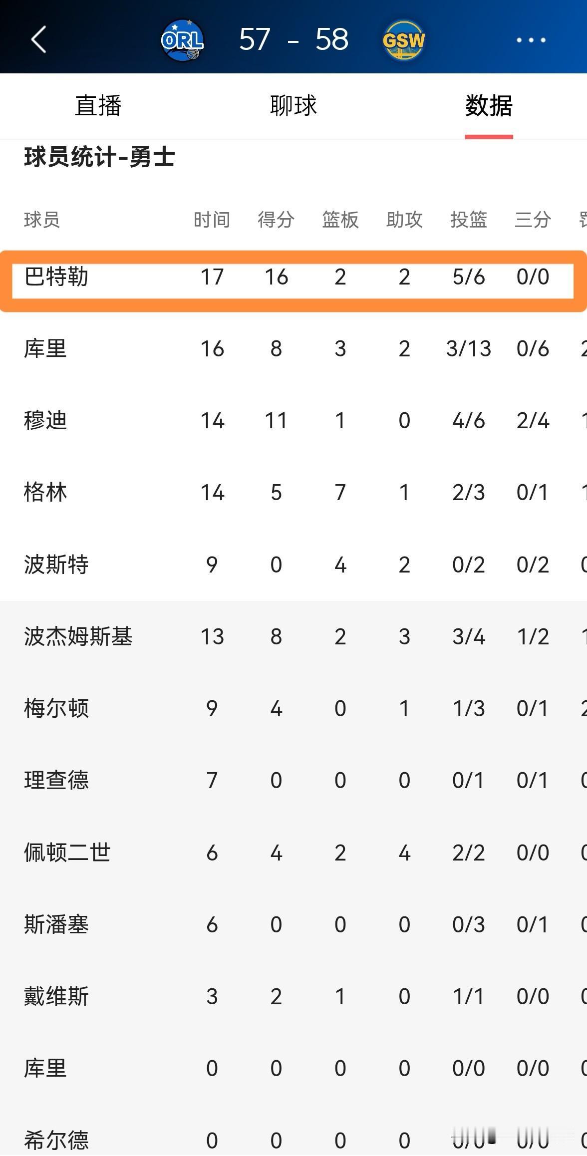 勇士超级球星巴特勒真是球队的定海神针!在今天勇士主场迎战魔术的上半场比赛中,巴特勒首发出战17分钟,投篮6中5,其中罚球7中6极其高效的砍下16分2篮板2助攻,没有出现任何的失误,带领球队以58:57领先对手结束了前两节的比赛。 坦白说,勇士之所以能够在库里发挥糟糕的情况下依然保持领先,最重要的原因就是有巴特勒的存在,巴特勒的表现真是太高效了。