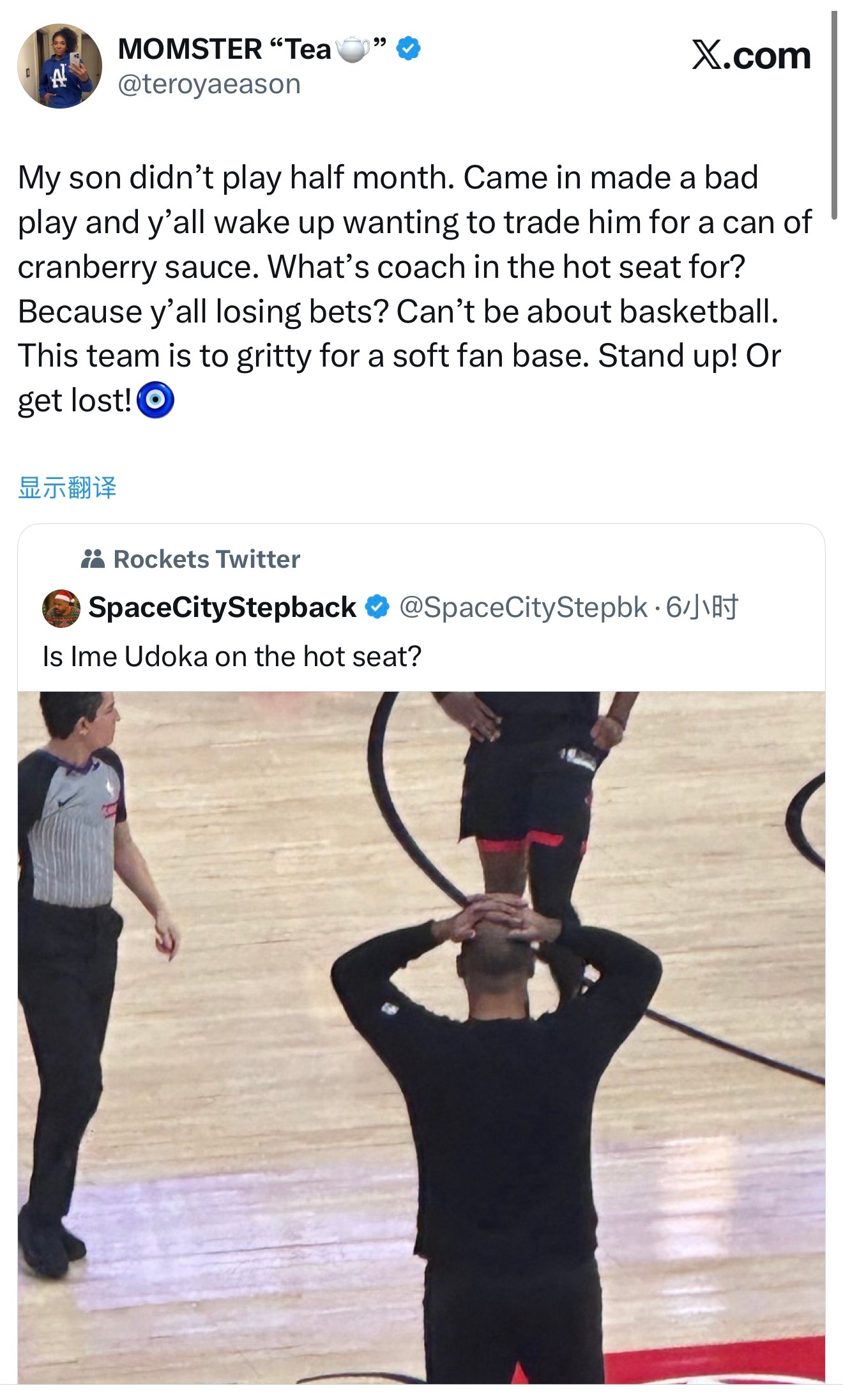 伊森妈:我儿子半个月没打球了。刚上场有个失误,你们就跟打了鸡血似的吵着要拿他换罐蔓越莓酱。教练帅位烫屁股关你们啥事?就因为你们赌球输了?肯定跟篮球无关。这支球队的铁血气质,配不上你们这群玻璃心球迷。有种撑到底!没种趁早滚蛋!🧿嘴替王者 篮球年末狂欢季休斯顿火箭