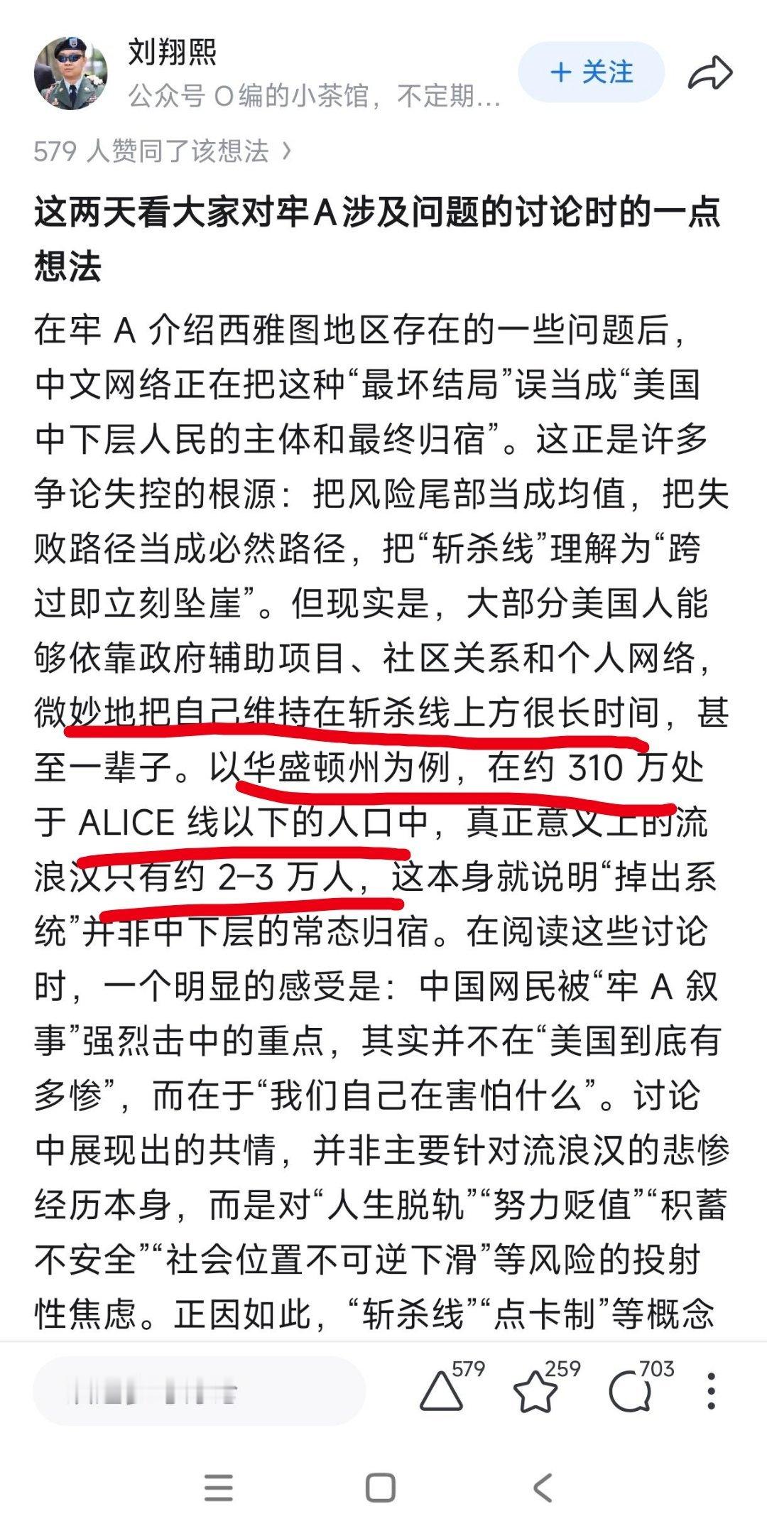 这次“美国斩杀线”的事,最让我震惊的是:在很多润美人群眼里,斩杀线这事居然是合情合理理所当然见怪不怪。比如图1这个贴,他不是否认“斩杀线”的存在。但是,810万人口的美国首都华盛顿,有310万人生活在“斩杀线”以下,他不觉得有任何问题,810万人口的城市有2、3万流浪汉,他不觉得有什么问题,大部分美国人可以“很微妙”地把生活维持在“斩杀线”上方很长时间甚至一辈子,他也不觉得有什么问题。比如图2,一个美国人上大学借了8万美元助学贷款,还了10年,已经还了12万美元,但本金还有7万6没还,怎么算都是高利贷,是吸血鬼,但他非但不觉得有什么问题,还要跳出来给这种制度进行辩护。放在中国,别说800万人口的城市出现2、3万流浪汉,冬天随机冻死几十个,哪怕冻死一个人都能引起网络地震,都会有人要被问责。所以看看人家美国,不仅有低人权优势,还能让美国人觉得这是正常现象,而且还有人真心维护并赞美这种制度。不服不行。
