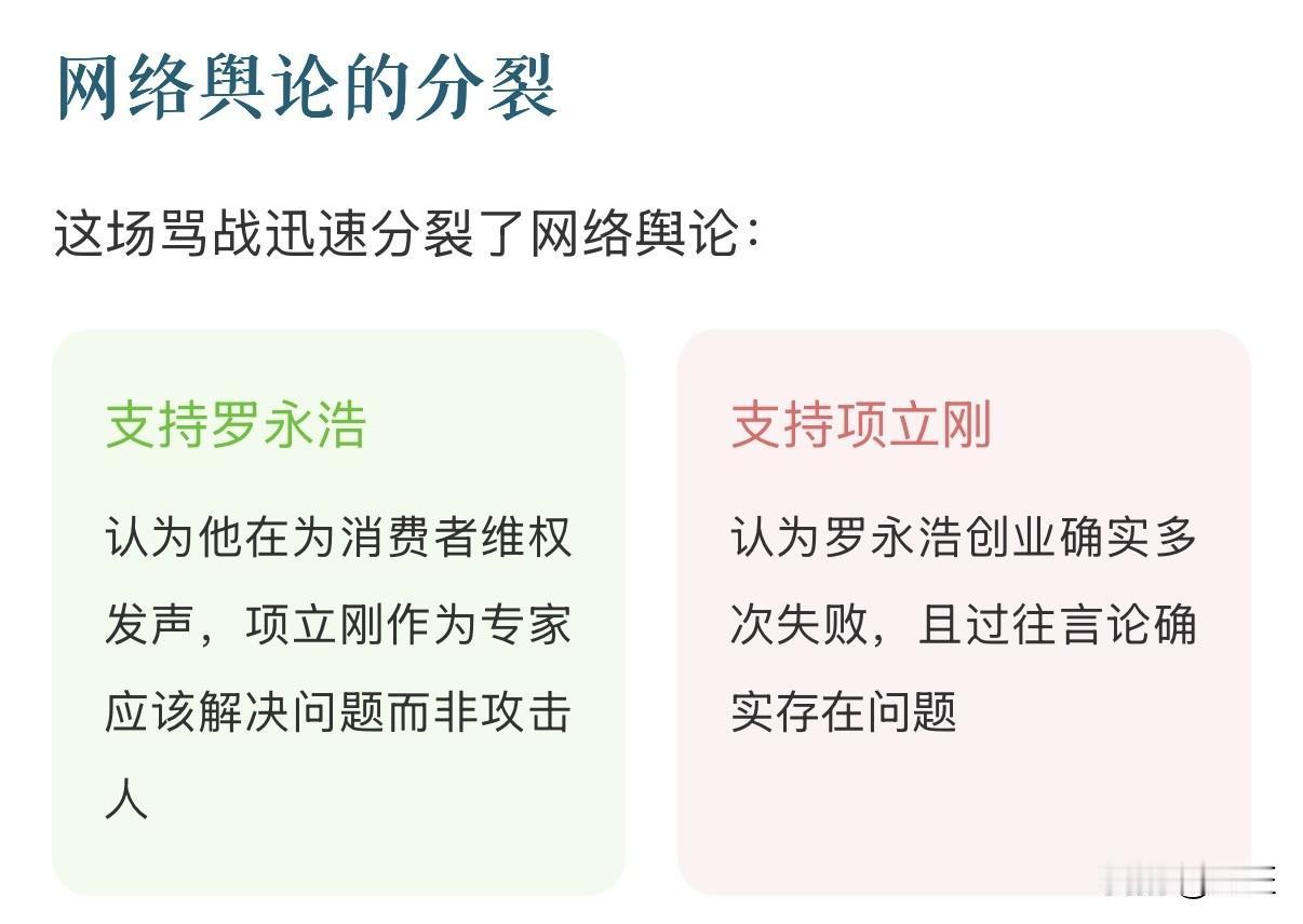 你支持谁?我支持翻车的那个。 一根网线引发的价值观审判,罗永浩与项立刚的“口水战”,他俩有一个得翻车. 12月18日:罗永浩朋友圈吐槽上海电信千兆宽带实际速率不足百兆, 12月19日:项立刚连发5条微博质疑技术细节,暗示罗永浩不懂基础常识。 12月20日:罗永浩怒怼"怀疑这人是智障",矛盾公开化。 12月21日:项立刚发表长文《我为什么要评论罗永浩?》,将争议升级为人生攻击。 12月22日:项立刚曝光罗永浩过往"精日"言论,争议进一步发酵。 罗永浩