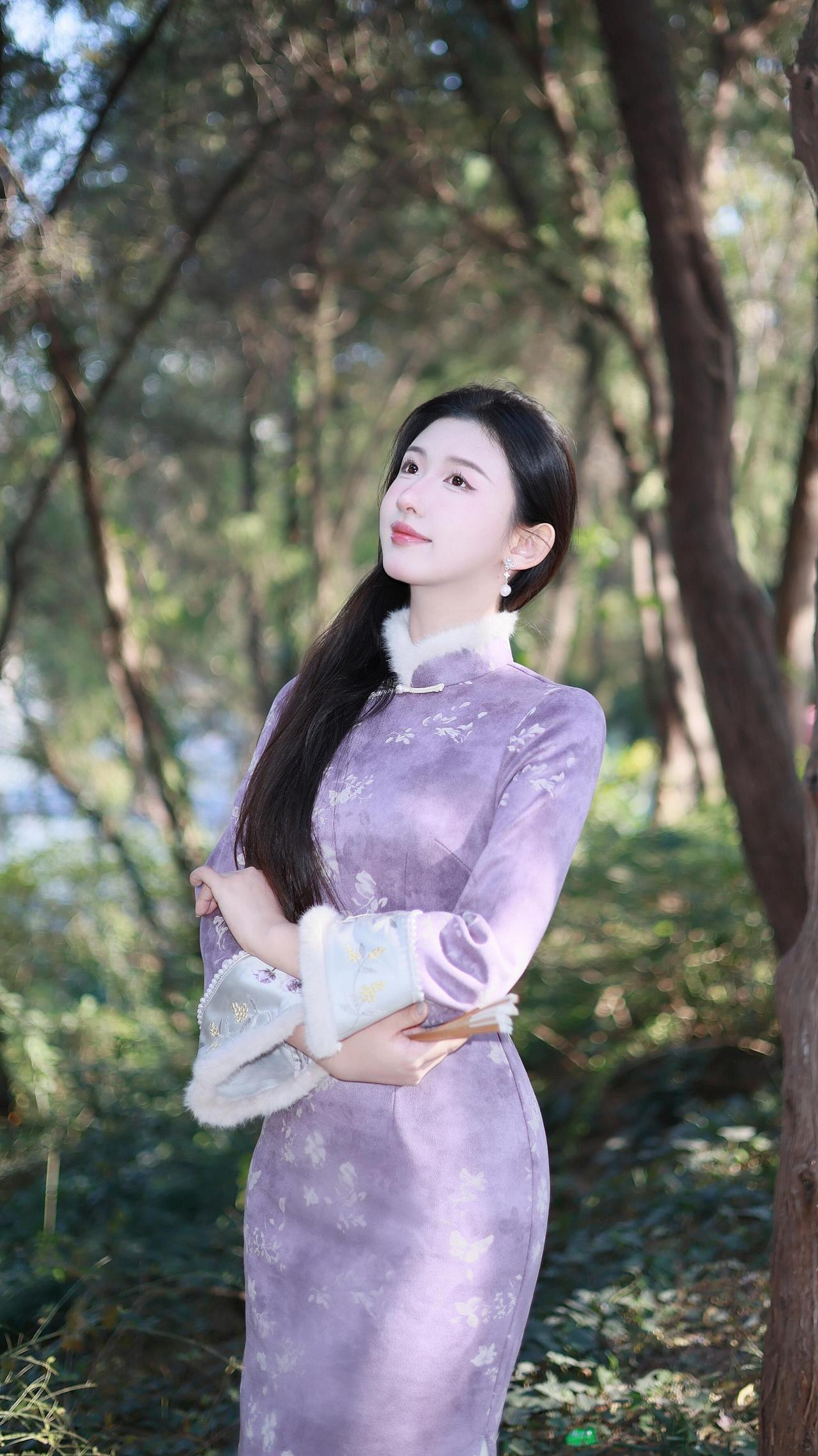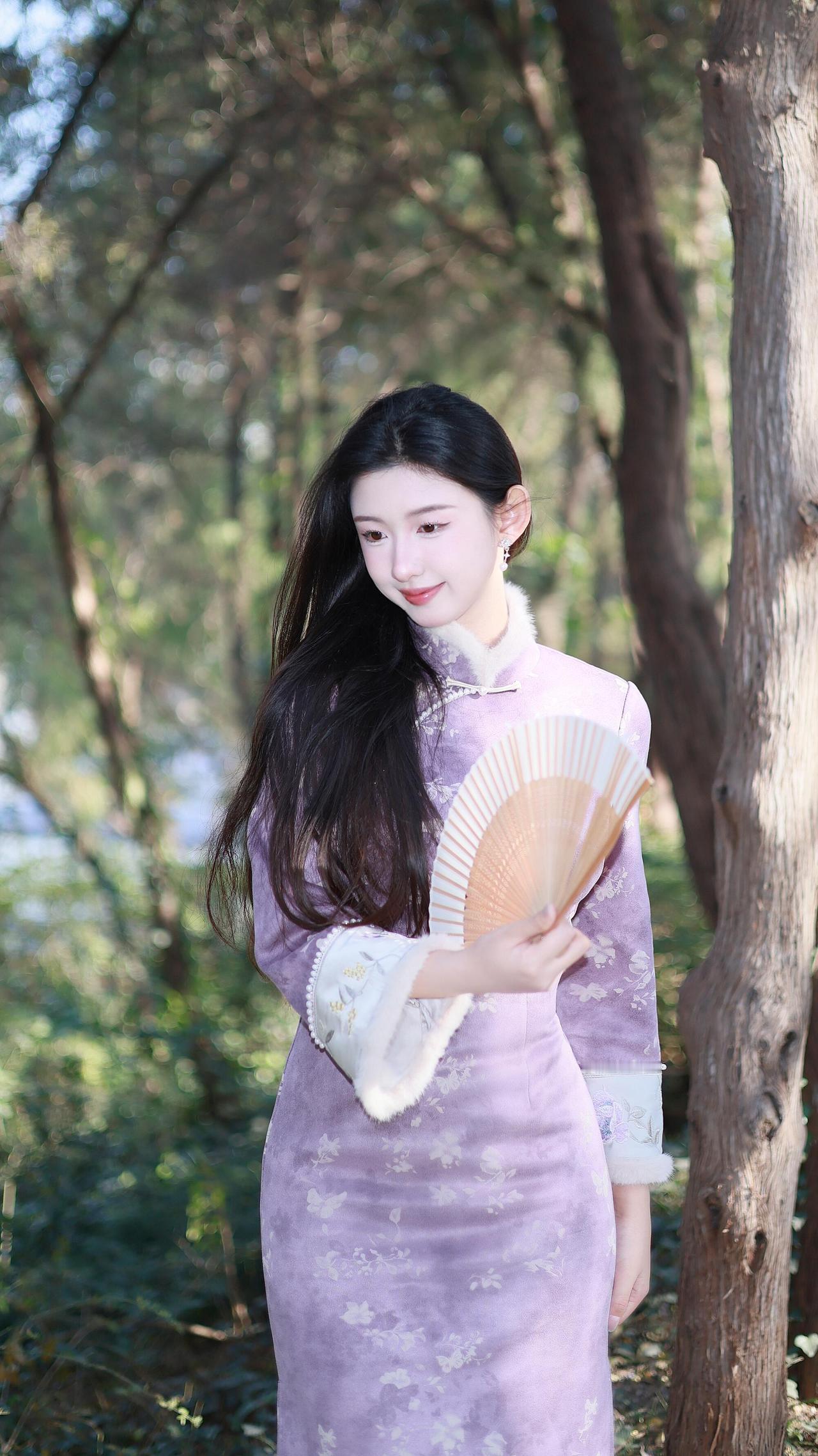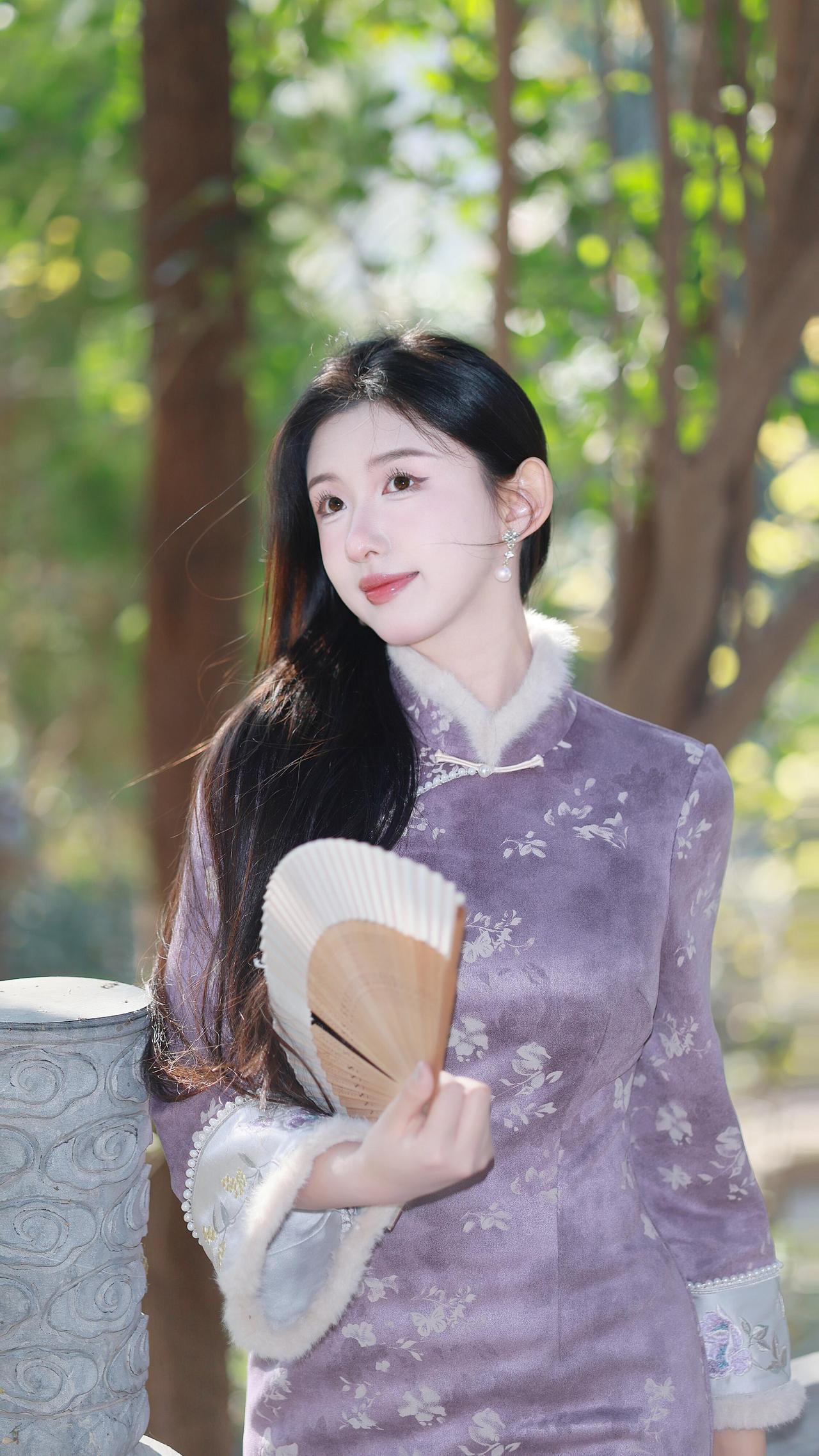 诉衷情令·紫衫旗袍弄扇吟 一壶炊烟煮黄昏,一盏旧茶浮亦沉。 紫衫裁得秋光软,毛领轻围玉颈温。 摇纸扇,倚亭根,树阴筛影落衣纹。 江南风骨藏眉底,慢捻青丝忆故人。 不叹流年催鬓改,只随闲意度朝昏。 风过林梢摇碎影,茶烟散尽又逢春。 笑把扇儿轻轻展,半是温柔半是真。 林间石径苔痕浅,一步清风一步云。 莫问红尘多少事,此间风月最销魂。