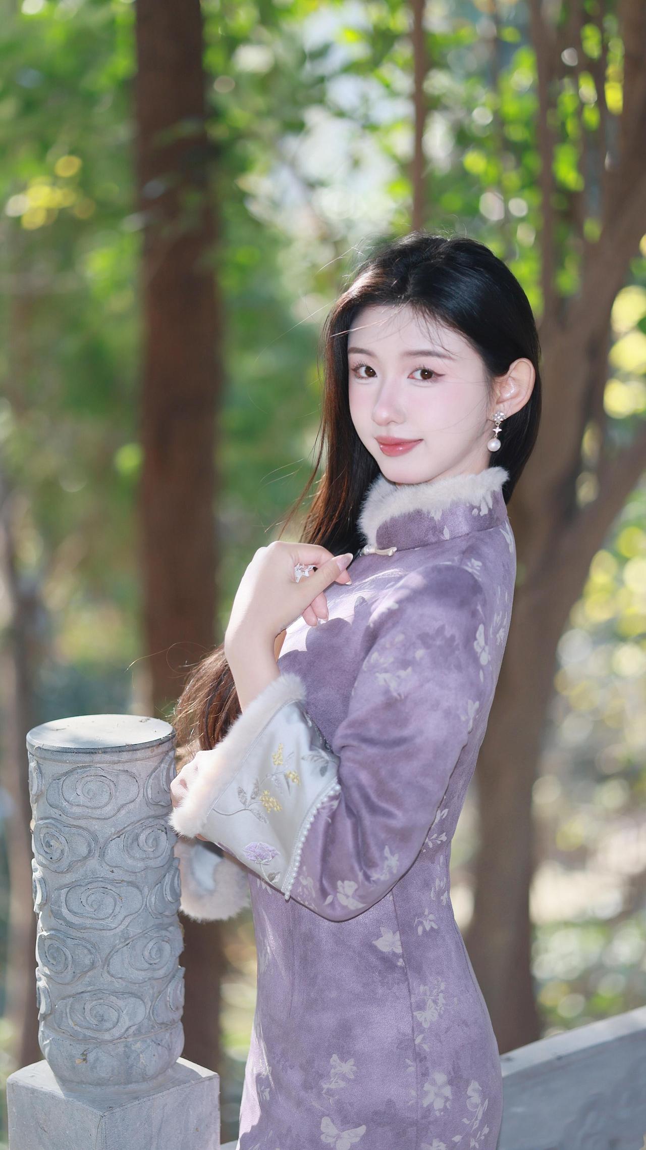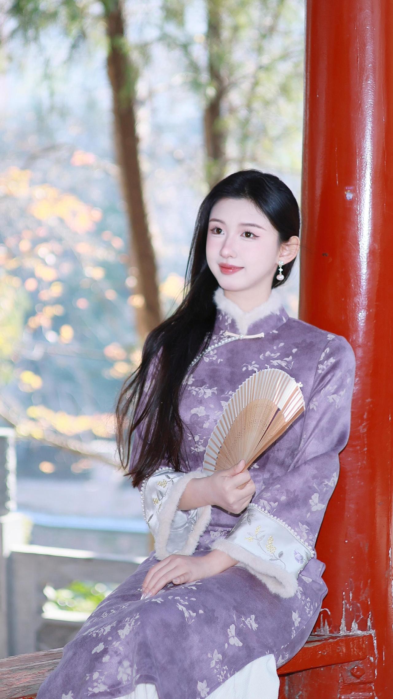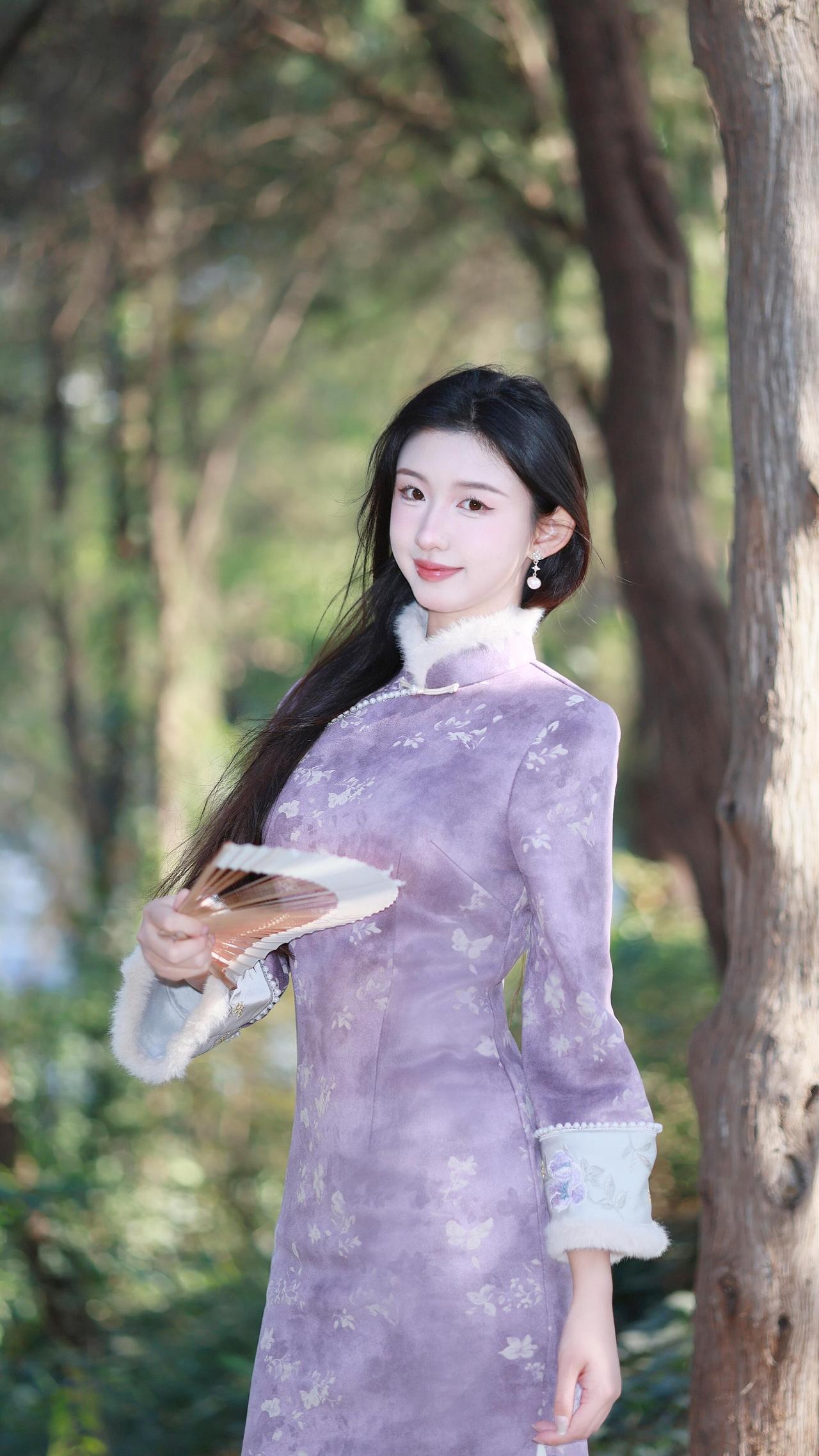 诉衷情令·紫衫旗袍弄扇吟 一壶炊烟煮黄昏,一盏旧茶浮亦沉。 紫衫裁得秋光软,毛领轻围玉颈温。 摇纸扇,倚亭根,树阴筛影落衣纹。 江南风骨藏眉底,慢捻青丝忆故人。 不叹流年催鬓改,只随闲意度朝昏。 风过林梢摇碎影,茶烟散尽又逢春。 笑把扇儿轻轻展,半是温柔半是真。 林间石径苔痕浅,一步清风一步云。 莫问红尘多少事,此间风月最销魂。