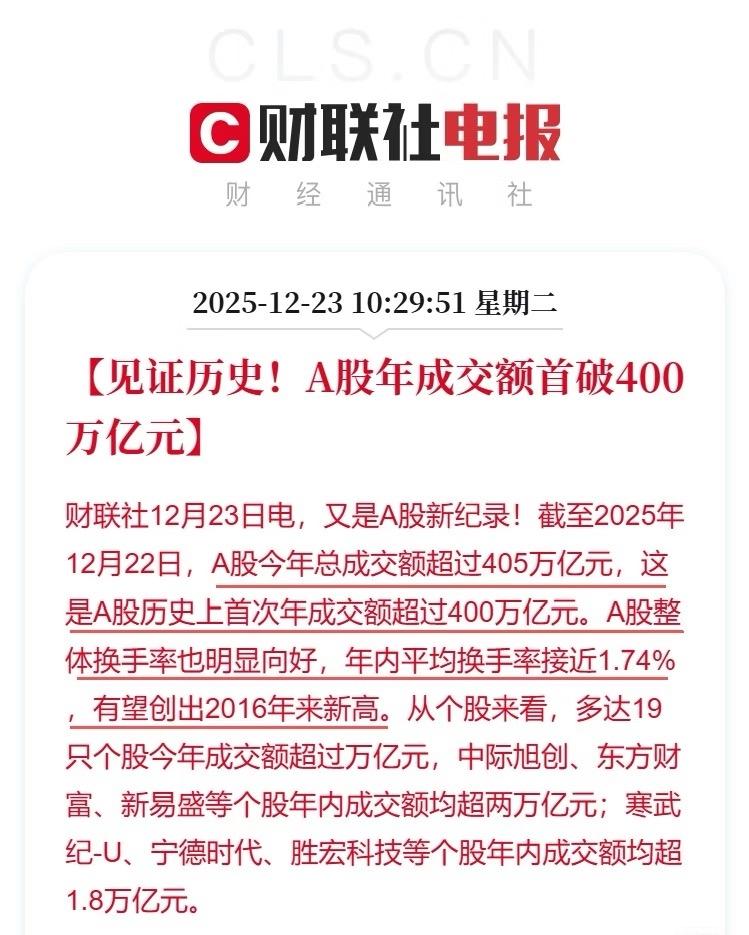见证历史!A股年成交额首破400万亿元 今年的A股就像电影市场一样 ,一部哪吒占了1/3电影总票房,新易盛工业 旭创这些浓眉大眼也占了1/?市场吧!