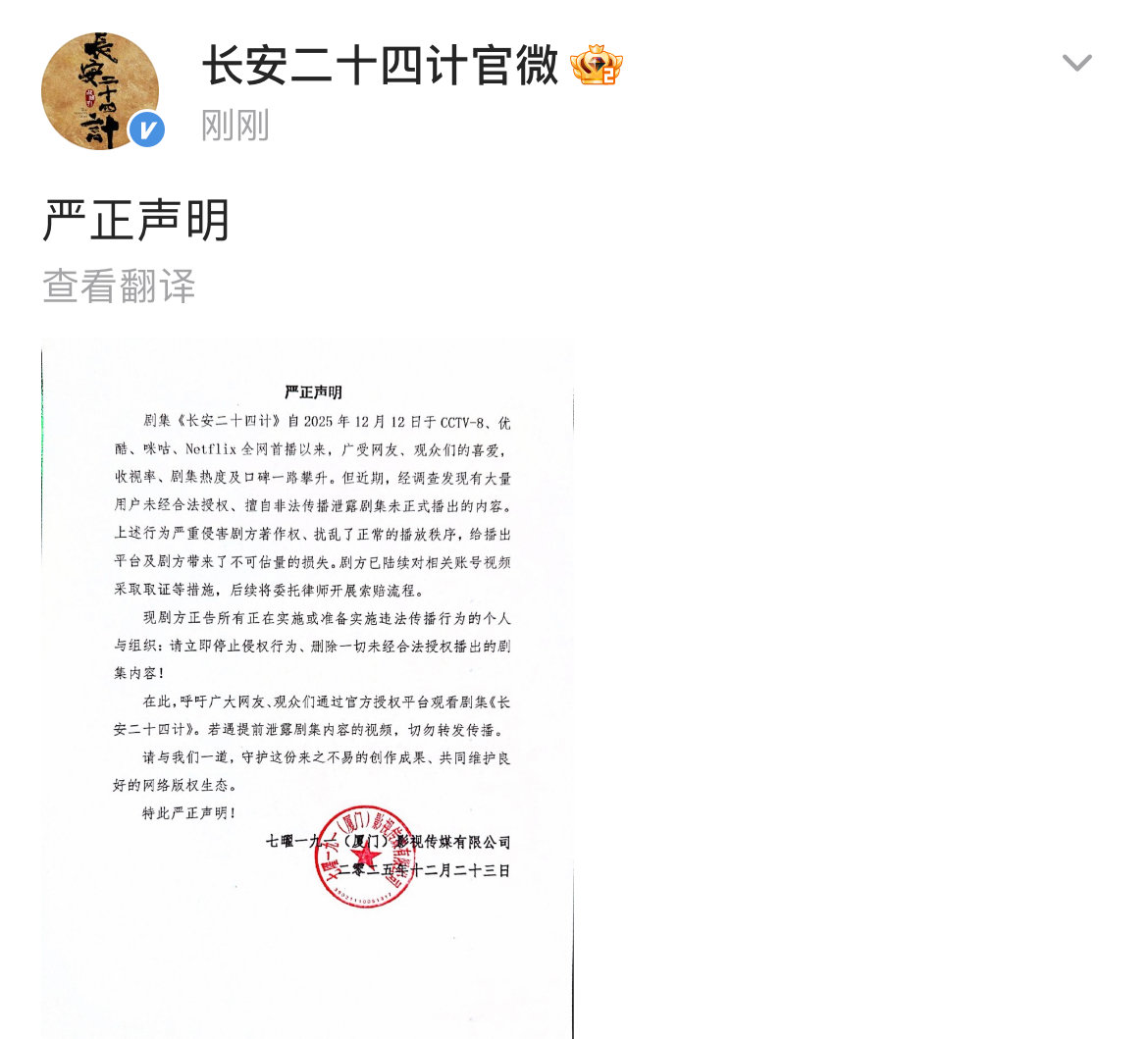 长安二十四计发声明长安二十四计呼吁通过官方平台观看剧集 12月23日,发声明呼吁网友通过官方授权平台观看剧集《长安二十四计》!“近期,经调查发现有大量用户未经合法授权、擅自非法传播泄露剧集未正式播出的内容。上述行为严重侵害剧方著作权、扰乱了正常的播放秩序,给播出平台及剧方带来了不可估量的损失。剧方已陆续对相关账号视频采取取证等措施,后续将委托律师开展索赔流程。现剧方正告所有正在实施或准备实施违法传播行为的个人与组织:请立即停止侵权行为、删除一切未经合法授权播出的剧集内容!在此,呼吁广大网友、观众们通过官方授权平台观看剧集《长安二十四计》。若遇提前泄露剧集内容的视频,切勿转发传播。”