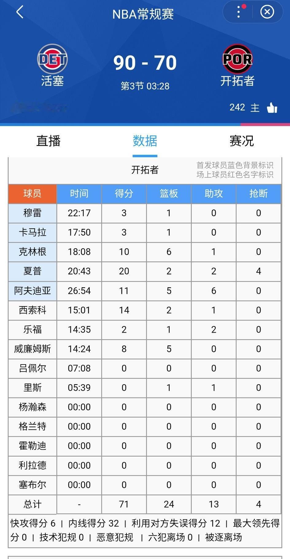 第三节还有3分钟,开拓者落后活塞20分,要追回有点难。 该上杨瀚森了吧,能让我坚持看下去的动力也只有杨瀚森了…… 小杨连续五场没上一分钟,斯普利特究竟想干嘛?