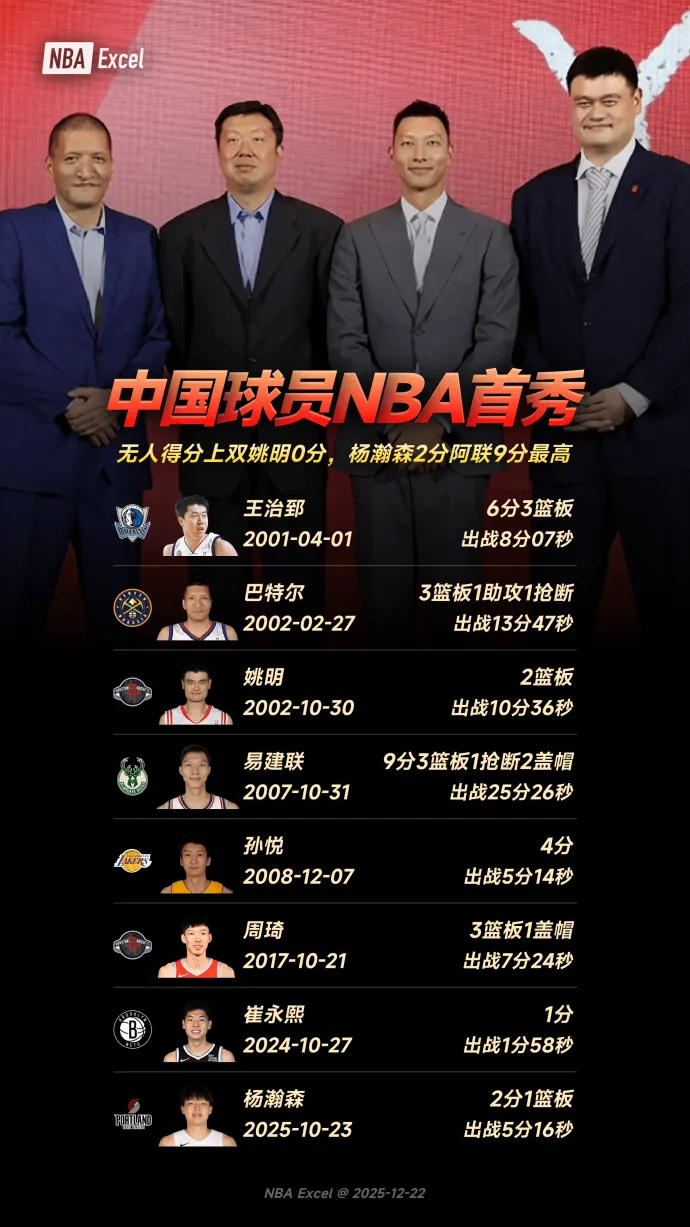 中国球员NBA首秀:无人得分上双,姚明0分,杨瀚森2分,阿联9分最高。