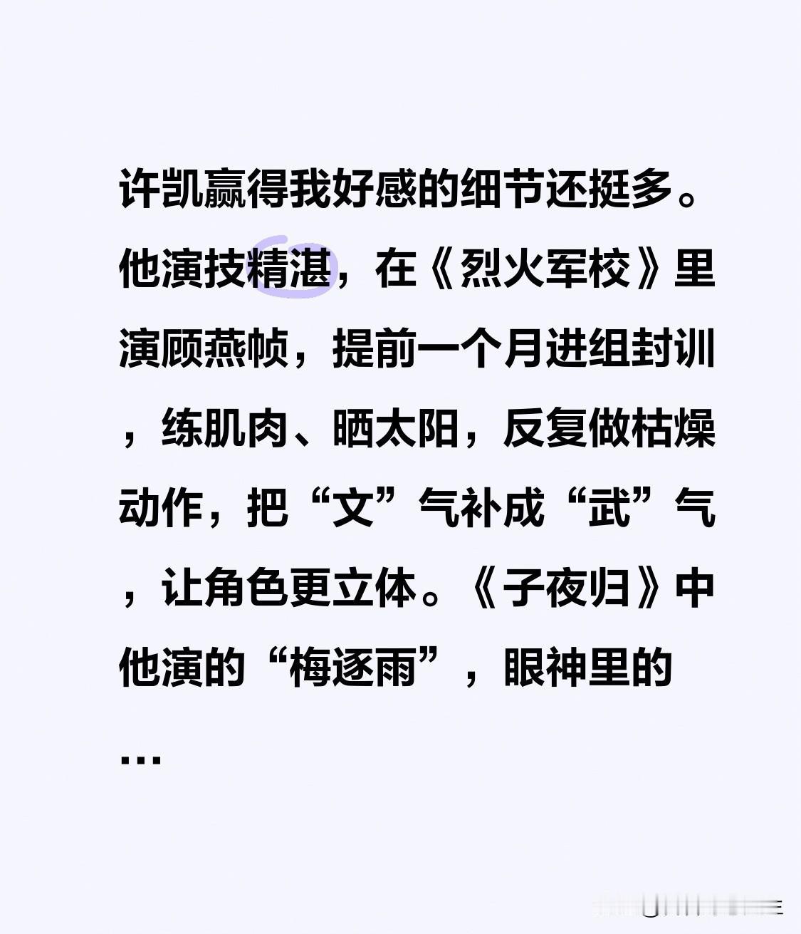 许凯赢得我好感的细节还挺多。他演技精湛,在《烈火军校》里演顾燕帧,提前一个月进组封训,练肌肉、晒太阳,反复做枯燥动作,把“文”气补成“武”气,让角色更立体。《子夜归》中他演的“梅逐雨”,眼神里的克制与锋芒,一看就是下了功夫。 生活里他低调自律,没什么绯闻。更让我对他好感倍增的是,11月26日香港发生火灾当晚,他捐出50万元用于救援与安置,不摆姿态,用行动展现担当。这样有演技又有爱心的许凯,很难让人不喜欢。 许凯 许凯穿搭 明星 [赞][赞][赞]