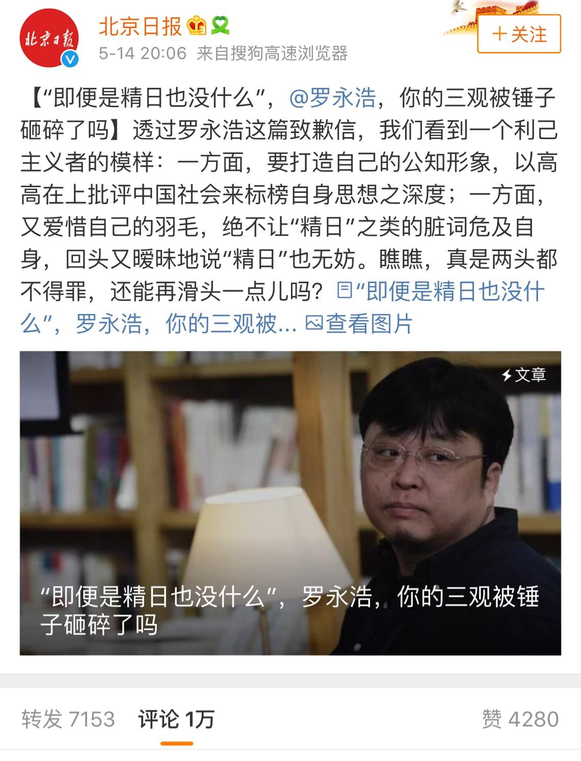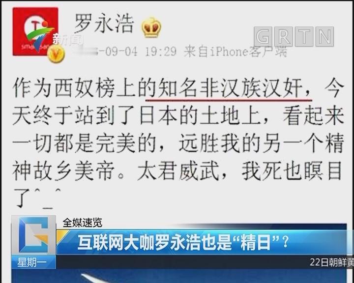 罗永浩现在还在中国互联网呼风唤雨,我们每个人都有错! 这个人早年在网上发表各种言论,自称太君,辱骂国人。 最重要的是,他死不悔改,有人说他精日,他竟然理直气壮说“精日也没什么”! 就是这样一个民族败类,现在毫发无损还可以在我们国土上耀武扬威,呼风唤雨!问题出在哪里? 如果一个明星或者其他公众人物说了这些话,早就被限制了,前途早就扼杀了,更不可能还有发言和表演的机会! 但是罗永浩不但可以,还可以一边骂你傻逼,一边割你的韭菜!