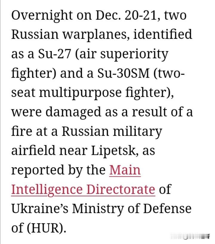 12月20日至21日夜间,乌军潜入俄军利佩茨克空军基地,一把🔥烧毁了俄军两架战斗机~Su~27和Su~30。 乌军准备了两周时间,提前踩点,摸清俄军巡逻路线以及警卫换岗时间。然后,一把🔥,任务完成,没被发现,安全撤离,漂亮👏。 Ukraine Free🇺🇦🔱🌻✊ 俄乌战争 乌克兰 聚焦俄罗斯乌克兰局势 俄罗斯乌克兰最新局势