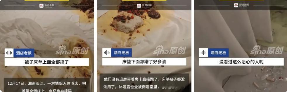 必须严惩! 长沙这对情侣的操作,真的太恶心了! 看着体面,做事却烂到根里!长沙一对情侣住酒店,把房间霍霍成垃圾场后溜之大吉,这哪是住店,分明是故意搞破坏! 饭菜倒满洁白床单,油污渗进床垫没法清理;杯子全摔碎,玻璃渣子满地;沐浴露洗发水倒得遍地黏糊糊,损失超2000元。更气人的是,两人吵完架一拍两散,房卡雨伞全不还,男方被联系上还装傻甩锅,拉黑联系方式玩消失。 这哪里是情侣拌嘴后的情绪发泄,简直是没教养的巨婴行为!自己的感情矛盾,凭什么让无辜酒店买单?老板坚决报警,真不是小题大做,这不仅是为了挽回损失,更是要告诉所有人:成年人的情绪失控,必须有代价! 你遇到过这种没素质的住客吗?碰到这种事该怎么治才解气?湖南酒店事件 酒店奇葩事 长沙奇葩事件 酒店奇葩操作 长沙揪心事 长沙黑心商家 长沙轻奢酒店
