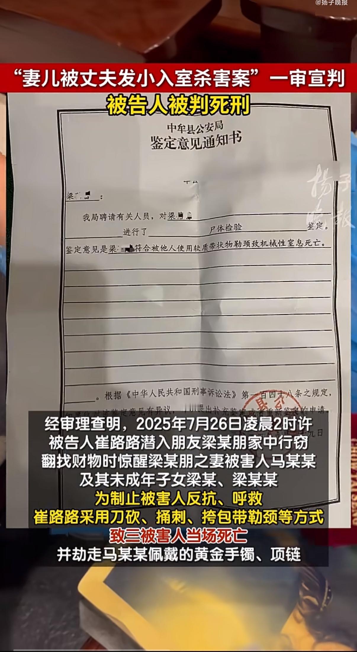 那件印着妻子笑脸的卫衣,裹着梁先生瘦得脱形的身子,一步步踏进了法庭,而被告席上坐着的,是他从小玩到大、睡过同一张北漂出租屋的发小。 谁能想到,这个喊了三十年兄弟的人,会偷偷配了他家钥匙,在他外出务工的深夜,对他的妻儿下了死手。凶手崔某某欠了一屁股赌债,早就盯上了梁家的财物,那天凌晨潜入后被梁妻惊醒,竟抓起菜刀疯狂砍杀。8岁的儿子听见母亲惨叫,扑上去用小小的身子挡刀,6岁的女儿吓得哭都没来得及,最后母子三人一个身中数十刀、面目全非,两个孩子一个被重创,一个被勒颈,没一个活下来。更让人毛骨悚然的是,凶手行凶后还冷静地清理现场,把空调开到16℃延缓尸体腐败,甚至撕碎了孩子的出生证明,转头还装模作样陪梁先生找人,连抽三包烟掩盖心虚。 梁先生对这个发小掏心掏肺,他来投奔就腾出自家废品站让他住,每天让妻子做饭招待,缺钱就二话不说借,就算之前家里丢了3万元怀疑过他,也因为顾及情面没追究。可这份掏心掏肺的善良,换来的却是灭门之灾。这五个月里,梁先生暴瘦26斤,每天靠酒精才能睡着,家里餐桌上始终摆着三副碗筷,孩子的幼儿园被褥、妻子的外套都原样保留,仿佛他们只是出门没回来。而今天,本该是妻子30岁的生日,他只能穿着印着她照片的卫衣,来法庭上为她和孩子讨一个公道。 这事儿看得人心里又疼又气,善良从来不是错,可没底线的善良就是在给恶人可乘之机。我们总说人心换人心,可有些人的良心早就被贪婪和嫉妒啃没了,你对他好,他觉得你傻;你过得幸福,他就心生歹念。崔某某就是这样,看着发小家庭美满,自己却负债累累,不仅不感恩帮扶,反而把屠刀对准了最信任他的人,连几岁的孩子都不放过,这哪里是人,分明是披着人皮的恶魔。 这不是个例,现实里太多熟人作案的悲剧,都是因为我们太容易被“多年情谊”“知根知底”蒙蔽了双眼。我们不是要变得冷血多疑,而是要明白,防人之心不可无从来都不是一句空话,信任需要慢慢建立,底线不能轻易打破。对那些品行不端、手脚不干净的人,再熟也得留个心眼,有些边界感,不是疏远,而是保护自己和家人的铠甲。 法庭上的审判还在继续,梁先生只求凶手死刑立即执行,可就算正义得到伸张,他的妻儿也回不来了。这场悲剧撕碎的不仅是一个家庭,还有我们对熟人社会的信任。你觉得梁先生的善良错了吗?来评论区说说你的看法。 来源:扬子晚报