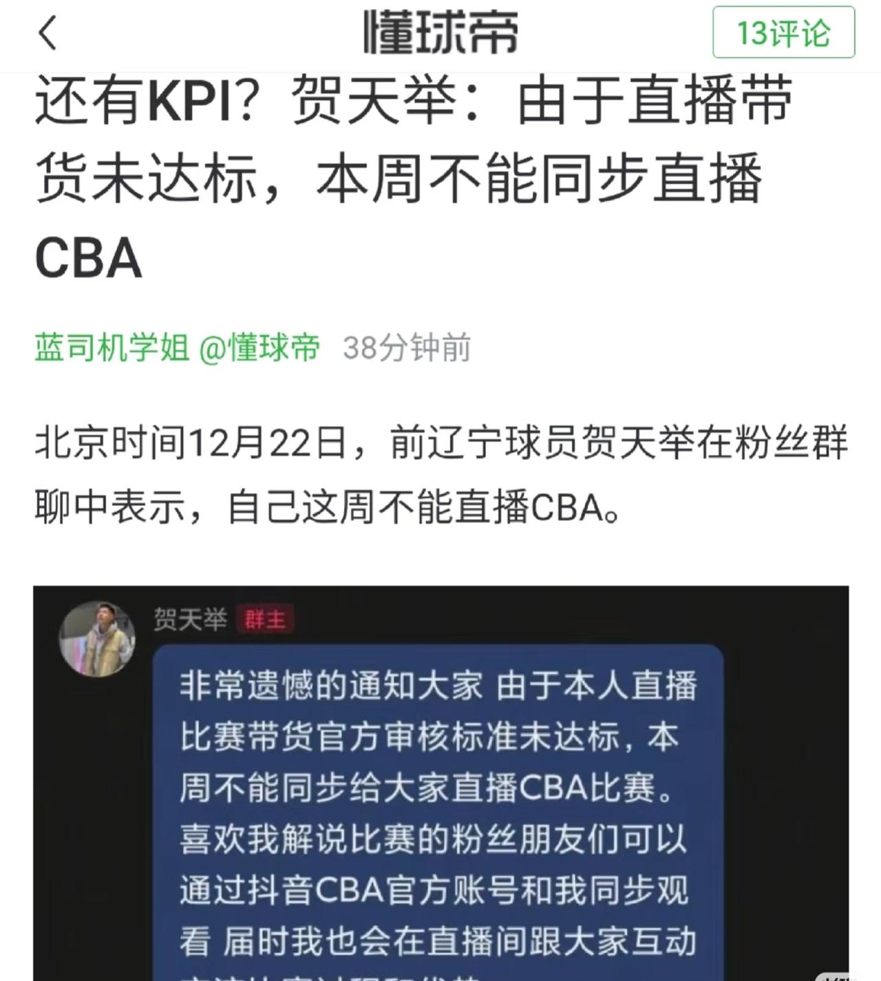 贺天举:由于带货指标不达标,本周不能直播CBA。 第一次听说解说员还有带货指标的,看来现在评价一个解说行不行的最重要指标就是带货能力的高低了,而不是他解说水平如何了,而解说员不仅要钻研也许能力,还要提高带货能力,要不然饭碗都给你端了。 这可能也是中国独有的现象,常此以往,不知道对CBA利弊如何。