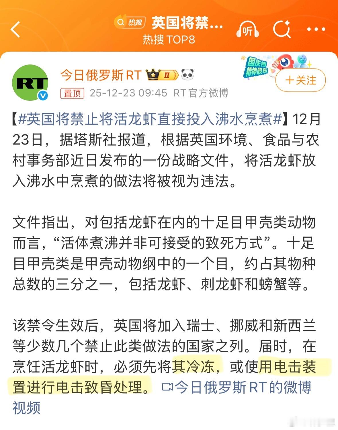 英国将禁止将活龙虾直接投入沸水烹煮冷冻就不残忍了吗?电击就不残忍吗?逮着烹煮表演